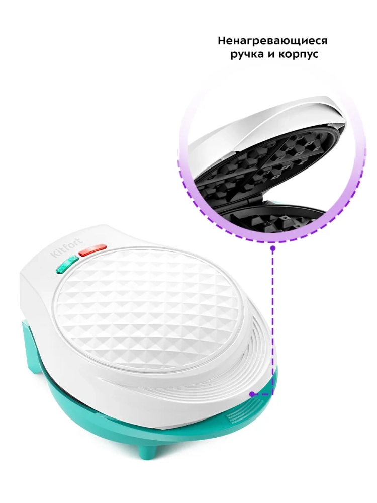 С помощью электрической вафельницы Kitfort КТ-1667 можно испечь толстые бельгийские вафли. Вафельница оснащена индикатором питания, термостатом для поддержания постоянной температуры поверхностей и индикатором, показывающим включение и отключение нагрева. В вафельнице установлены независимые нагреватели в каждой половинке формы. На нижней части корпуса предусмотрено место для хранения шнура. Противоскользящие ножки не дают прибору скользить по столу во время готовки. Корпус выполнен из термоустойчивого пластика, а формы покрыты антипригарным покрытием.