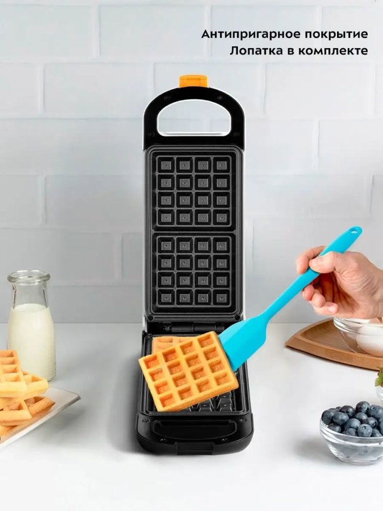 В комплекте поставляется силиконовая лопатка, при помощи которой удобно снимать готовые вафли с панелей.
