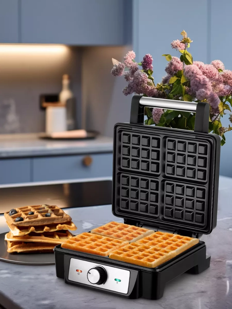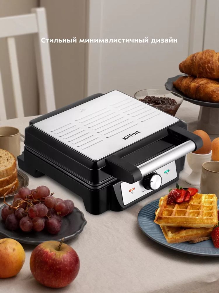 Вафельница оснащена индикатором питания, термостатом для поддержания температуры панелей и индикатором нагрева, который покажет, когда панели разогреются.