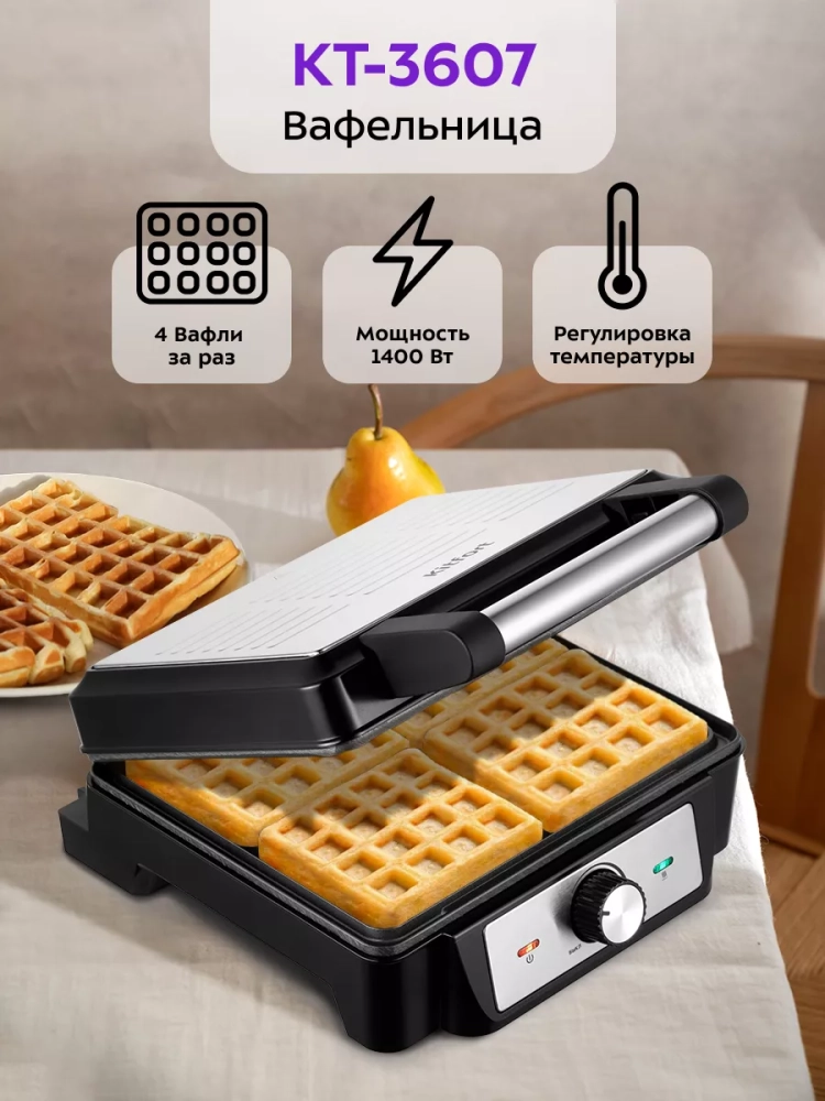 С помощью вафельницы Kitfort КТ-3607 вы сможете испечь 4 бельгийские вафли за раз. Данная модель оснащена регулятором температуры, что позволит вам выбирать температуру приготовления вафель.