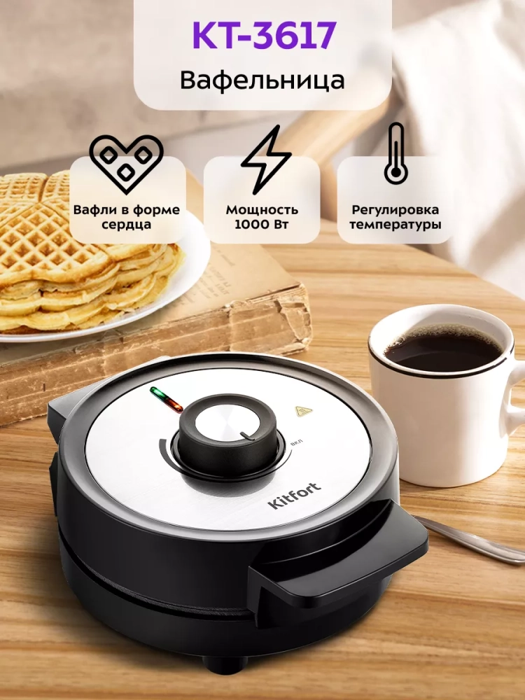 С помощью электрической вафельницы Kitfort КТ-3617 вы сможете печь бельгийские вафли, которые при желании можно разделить на маленькие сердечки. Вафельница рассчитана на приготовление 1 большой вафли или 5 маленьких вафель.