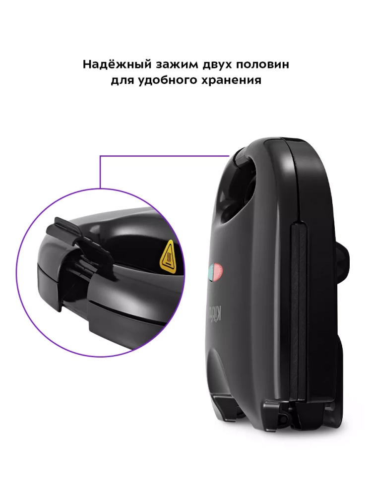 Корпус выполнен из сочетания пластика и нержавеющей стали. Отсек на нижней части корпуса предназначен для удобного хранения шнура питания. Зажим на ручке удерживает крышку вафельницы в закрытом состоянии, что делает готовку, транспортировку и хранение более удобными.