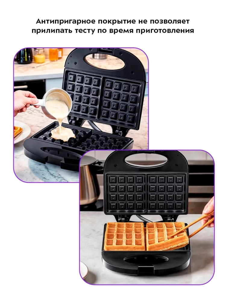 Антипригарное покрытие панелей не дает прилипнуть тесту в процессе приготовления и позволяет готовить с минимальным количеством масла или без него. Также антипригарное покрытие облегчает чистку панелей.