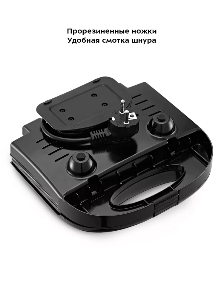 Корпус выполнен из сочетания пластика и нержавеющей стали. Отсек на нижней части корпуса предназначен для удобного хранения шнура питания. Зажим на ручке удерживает крышку вафельницы в закрытом состоянии, что делает готовку, транспортировку и хранение более удобными.