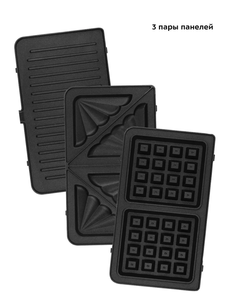 У прибора три пары панелей: панели для приготовления вафель, панели для приготовления бутербродов и ребристые панели для гриля. Высокая температура нагрева панелей способствует быстрому приготовлению продуктов. Для удобства ухода панели сделаны съемными — их можно мыть под проточной водой.