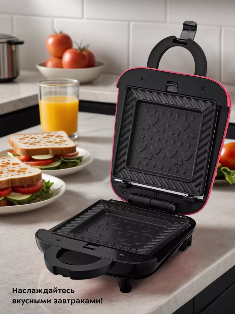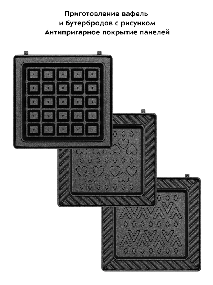 У прибора три вида панелей: пара панелей для приготовления вафель и две пары панелей для приготовления тостов с разными узорами. Высокая температура нагрева панелей способствует быстрому приготовлению продуктов. Для удобства ухода панели сделаны съемными — их можно мыть под проточной водой.