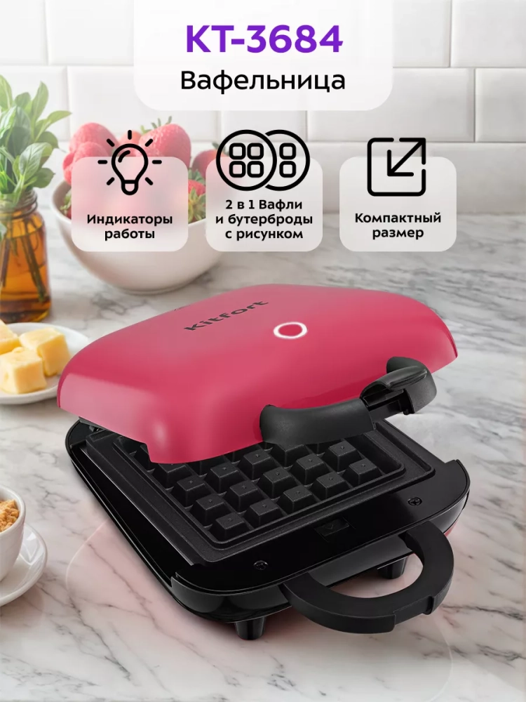 Вафельница Kitfort КТ-3684 (2 в 1) предназначена для приготовления бельгийских вафель, бутербродов, сэндвичей, гренок, тостов и других блюд.