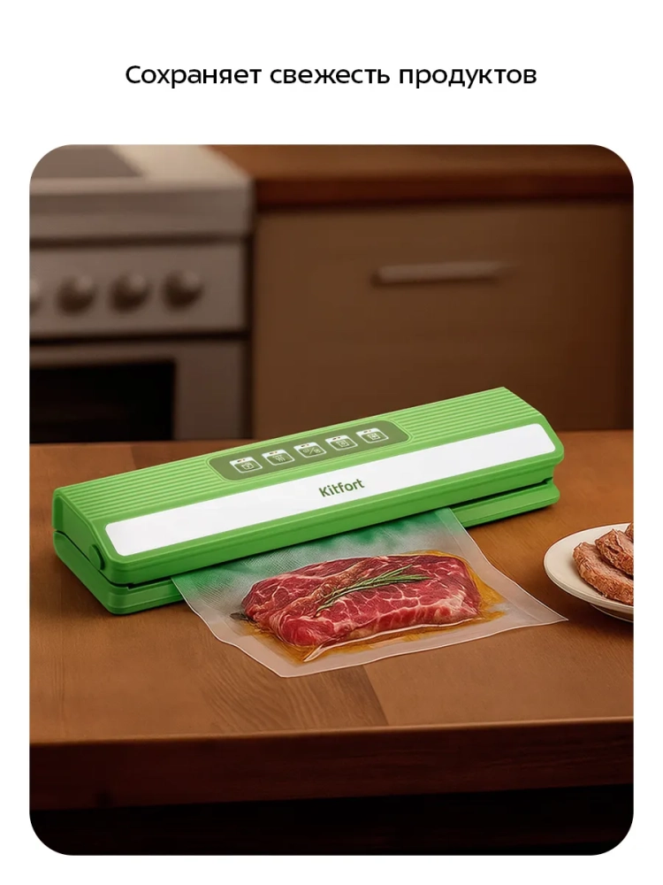Вакууматор Kitfort КТ-1558 — кухонное устройство для вакуумной упаковки продуктов. Вакуумирование позволяет защитить от пыли, грязи, сохранить аромат и продлить срок годности пищевых продуктов. Такой метод хранения уменьшает риск развития бактерий, которые появляются из-за взаимодействия пищи с воздухом. Удаление воздуха из пакета гарантирует замедление процессов брожения, окисления и испарения, позволяя сохранить приятный внешний вид и качество самых разных продуктов питания. Вакуумирование значительно ускоряет засолку и маринование. Вакууматор применяют не только в кулинарии, но и в других областях. Для туристических и бытовых нужд в вакуумный пакет можно поместить документы, деньги, спички, лекарства, мобильный телефон, карту, компас и другие предметы. Это защитит их от сырости и попадания воды. Серебряные украшения, коллекционные монеты, значки, упакованные таким способом, не будут тускнеть со временем. Вакуумная упаковка продуктов и вещей помогает значительно сэкономить место как в холодильнике или чемодане, так и во всей квартире. Пакеты с удаленным воздухом и сжатым содержимым занимают гораздо меньше пространства. В KT-1558 есть возможность вакуумирования сухих и влажных продуктов. Импульсный режим техники поможет удалить нужный объем воздуха без последующего запечатывания пакета. Вы также можете запечатать пакет без предварительного вакуумирования. У прибора для запайки есть функция вакуумирования продуктов в специальных контейнерах (в комплект не входят). Беспроводной вакуум упаковщик KT-1558 работает от аккумулятора, поэтому его удобно брать с собой в поездки. Питание: USB Type-C =5 В, 1 А. Мощность: 70 Вт. Аккумулятор: Li-Ion 7,4 В, 2 А*ч (14,8 Вт*ч). Класс защиты от поражения электрическим током: III. Количество циклов работы: 40. Время зарядки: 2,5 ч. Создаваемое разрежение: 0,6 бар. Максимальная ширина пакета для вакуумирования: 30 см. Ширина шва: 2,5 мм. Уровень шума: ≤80 дБ. Длина шнура USB Type-C: 0,8 м. Размер устройства: 370 x 96 x 56 мм.