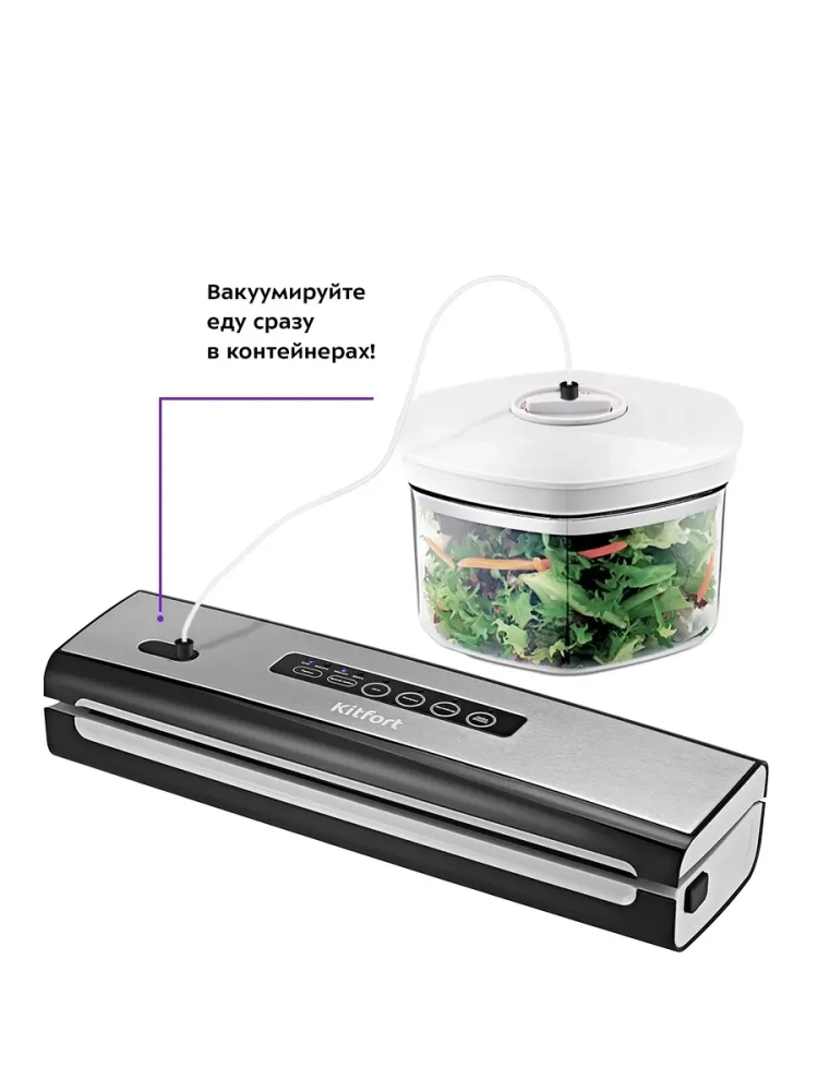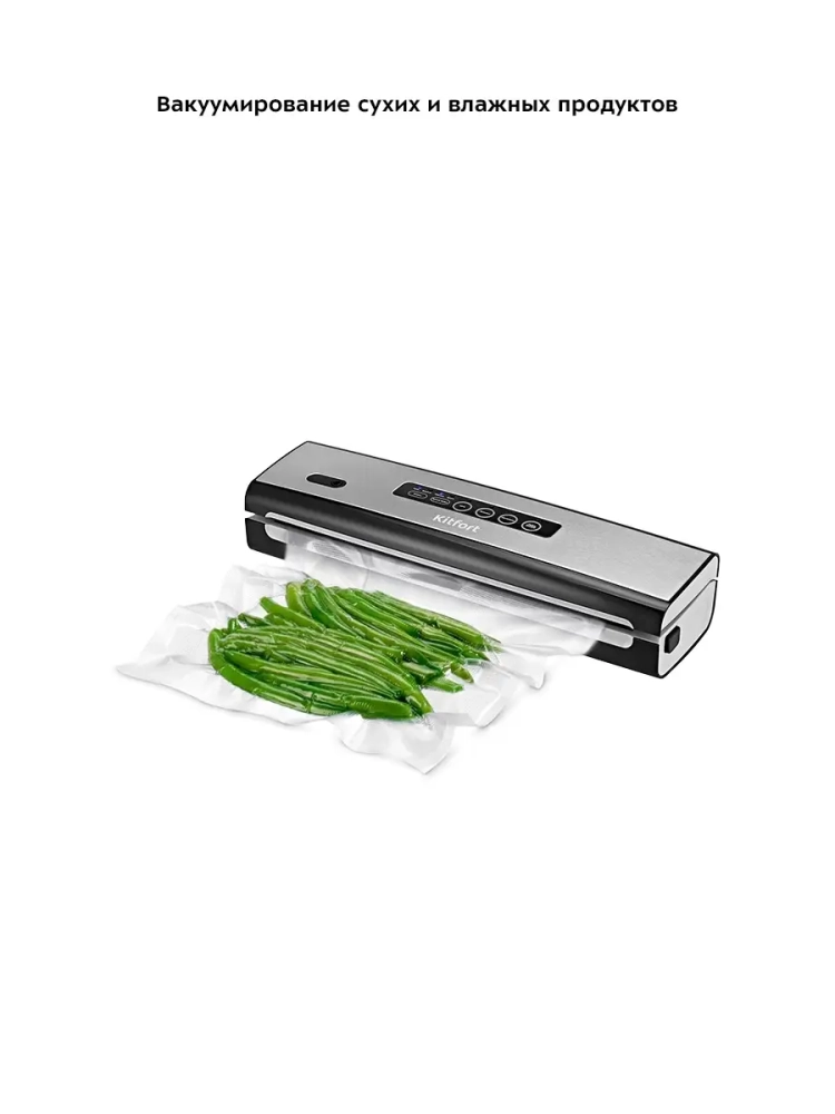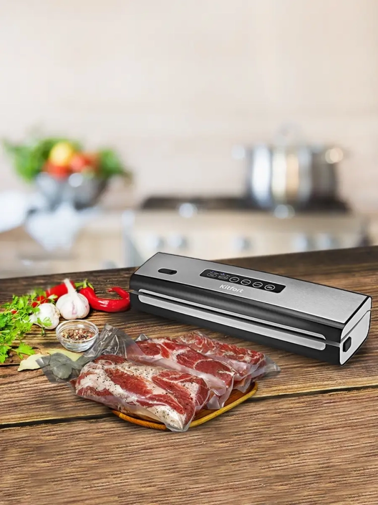 Вакууматор Kitfort КТ-1510 — устройство для вакуумной упаковки продуктов. Вакуумирование позволяет защитить от пыли, грязи, сохранить аромат и продлить сроки годности пищевых продуктов. Такой метод хранения уменьшает риск развития бактерий, которые появляются благодаря взаимодействию пищи с воздухом. Удаление воздуха из пакета гарантирует замедление процессов брожения, окисления и испарения, позволяя сохранить приятный внешний вид и качество самых разных продуктов питания.