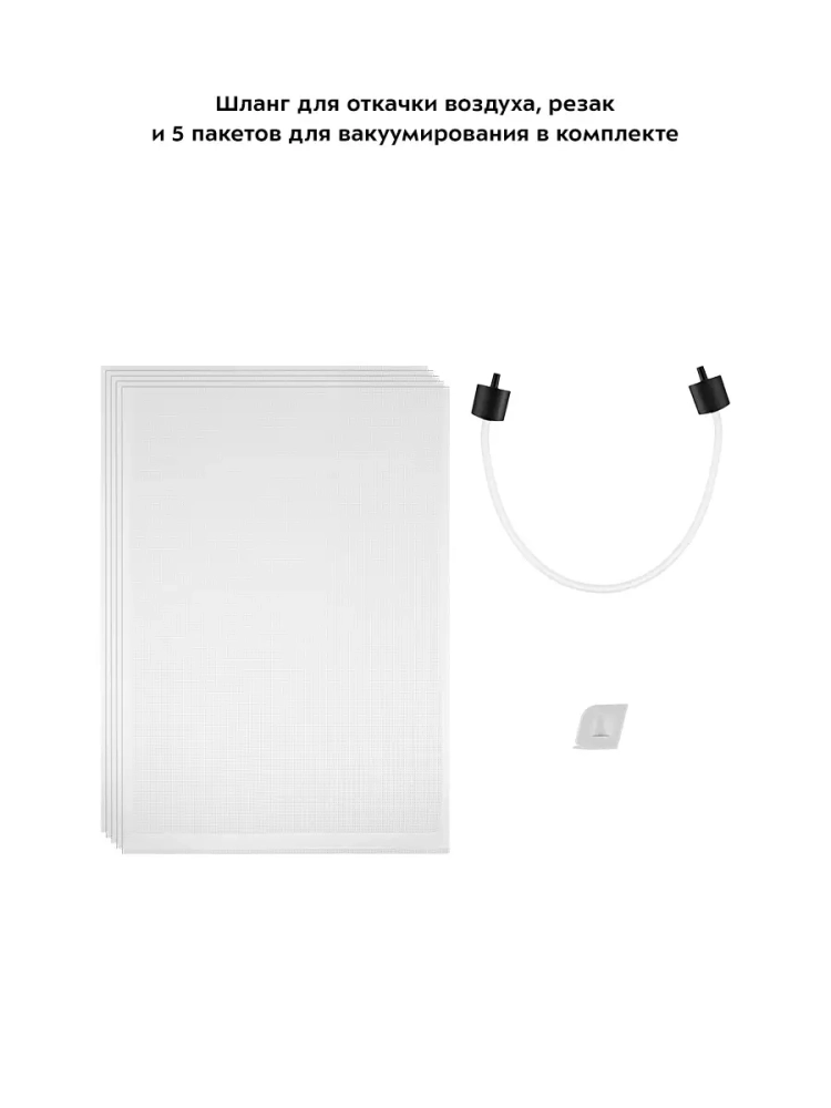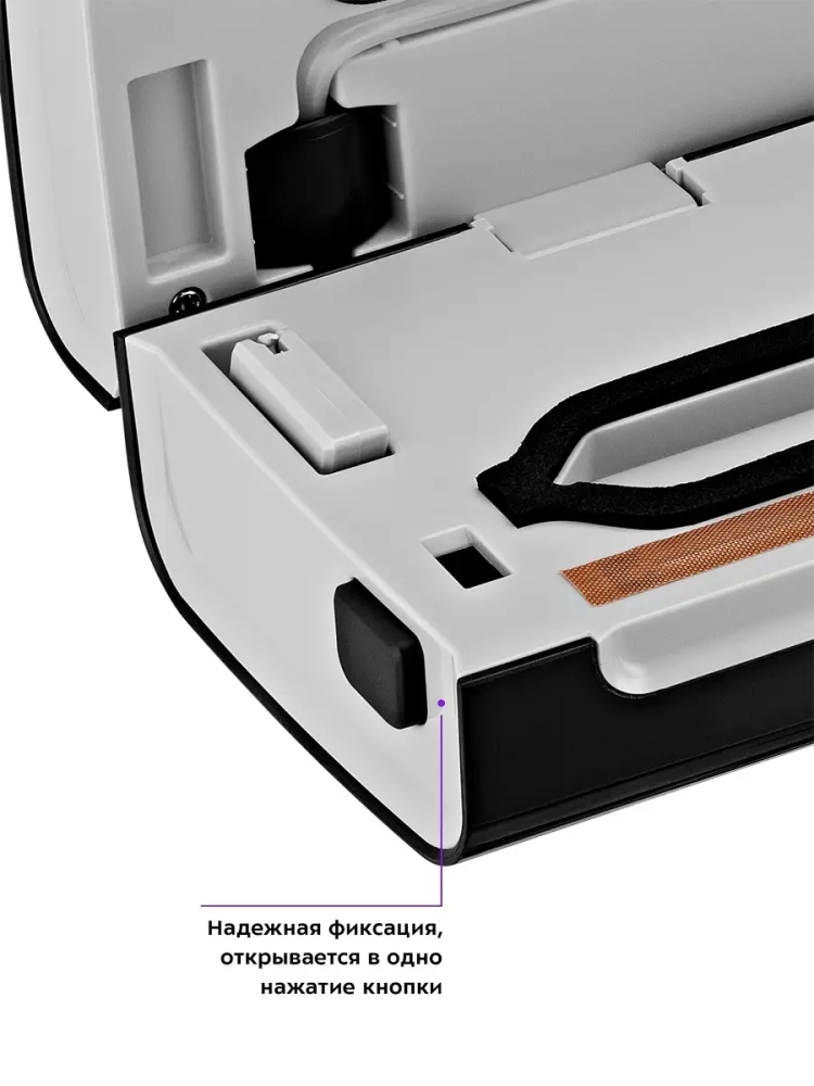 Корпус вакууматора КТ-1510 пластиковый с металлической вставкой на крышке. Сенсорные кнопки позволяют легко выбрать нужный режим. Маленький резак и шланг для откачки воздуха удобно складываются в специальные держатели. В таком положении они не потеряются и всегда будут под рукой. Резак поможет отрезать пакет нужной вам длины, а также срезать запаянный шов. Шланг для откачки воздуха позволяет создать вакуум в специальных контейнерах, предназначенных для вакуумирования. Прорезиненные ножки делают устройство более устойчивым и не дают скользить по столу во время работы.