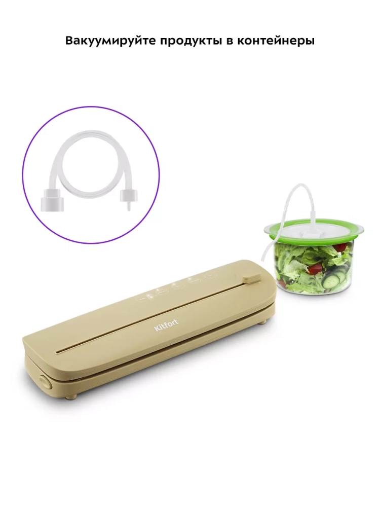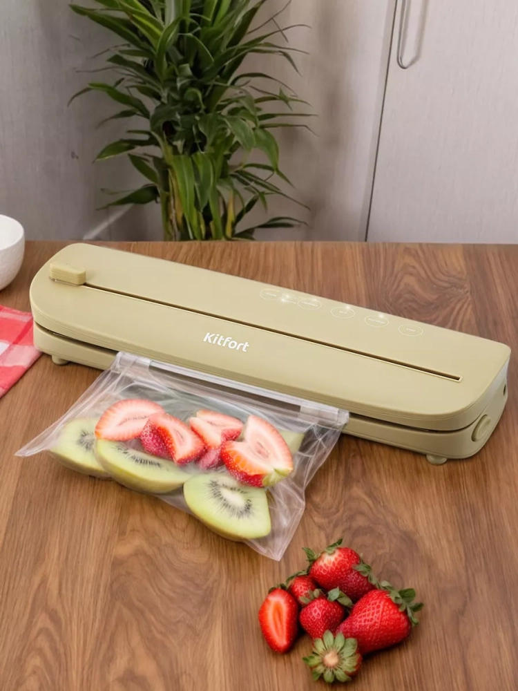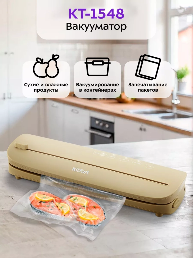 Вакууматор Kitfort КТ-1548 — устройство для вакуумной упаковки продуктов. Вакуумирование позволяет защитить от пыли, грязи, сохранить аромат и продлить срок годности пищевых продуктов. Такой метод хранения уменьшает риск развития бактерий, которые появляются из-за взаимодействия пищи с воздухом. Удаление воздуха из пакета гарантирует замедление процессов брожения, окисления и испарения, позволяя сохранить приятный внешний вид и качество самых разных продуктов питания. Вакуумирование значительно ускоряет засолку и маринование.