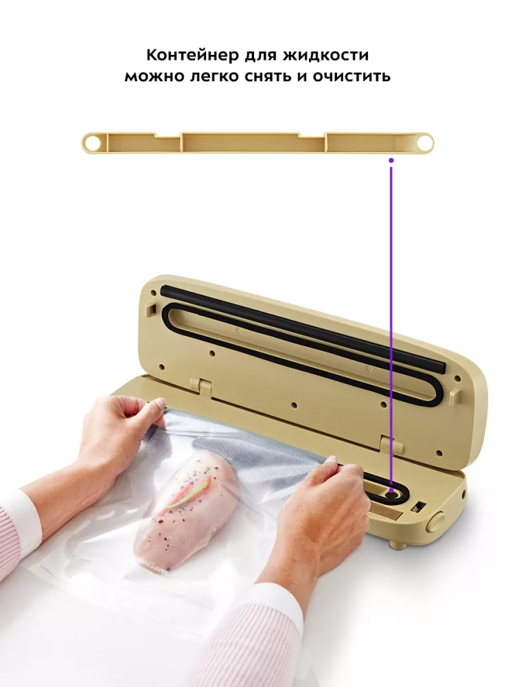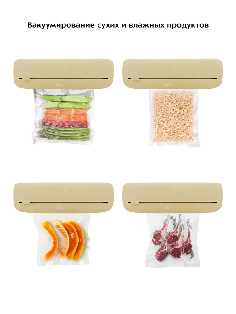 В KT-1548 есть возможность вакуумирования сухих и влажных продуктов. Вы можете запечатать пакет без предварительного вакуумирования. Также у прибора есть функция вакуумирования продуктов в специальных контейнерах.