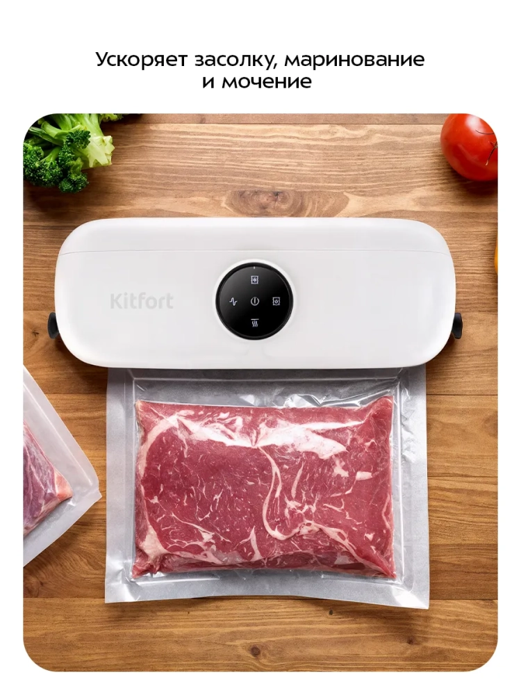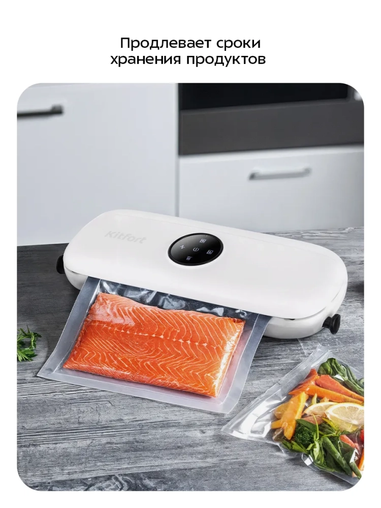Вакууматор Kitfort КТ-1549 — устройство для вакуумной упаковки продуктов. Вакуумирование позволяет защитить от пыли, грязи, сохранить аромат и продлить срок годности пищевых продуктов. Такой метод хранения уменьшает риск развития бактерий, которые появляются из-за взаимодействия пищи с воздухом. Удаление воздуха из пакета гарантирует замедление процессов брожения, окисления и испарения, позволяя сохранить приятный внешний вид и качество самых разных продуктов питания. Вакуумирование значительно ускоряет засолку и маринование.