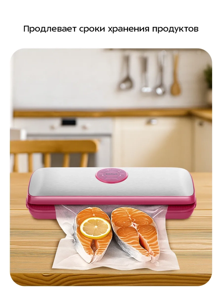 Вакууматор для продуктов Kitfort КТ-1561 — это современное бытовое электрическое устройство, предназначенное для вакуумной упаковки различных продуктов. Вакуумирование позволяет надежно защитить продукты от пыли и грязи, сохраняя их аромат и продлевая срок годности. Этот метод хранения уменьшает риск развития бактерий, возникающих из-за взаимодействия пищи с воздухом. Удаление воздуха из пакета замедляет процессы брожения и окисления, что помогает сохранить внешний вид и качество продуктов питания. Вакууматор для кухонной запайки КТ-1561 прост в использовании: поместите продукт в специальный пакет для вакуумирования, уложите открытый край пакета в вакуумную камеру устройства, закройте крышку и включите прибор. Вакууматор удалит воздух из пакета автоматически. Устройство вакуум упаковщика Kitfort подходит не только для кулинарии: оно может использоваться для защиты документов или других предметов от влаги при помощи вакуумного пакета. Это делает его полезным как дома, так и на отдыхе или в путешествиях. Вакуумная упаковка техники помогает экономить место в холодильнике или чемодане благодаря компактности сжатого содержимого. Пакеты с удаленным воздухом занимают меньше пространства. Модель KT-1561 оснащена режимами для сухих и влажных продуктов; также есть отдельный режим запечатывания без предварительного вакуумирования. Световая индикация уведомляет о процессе работы устройства. Характеристики: напряжение ~220–240 В; мощность 110 Вт; класс защиты II; разряжение ≤0,8 бар; максимальная ширина пакета 28 см; ширина шва 2,5 мм; уровень шума ≤80 дБ; длина шнура 1 м.