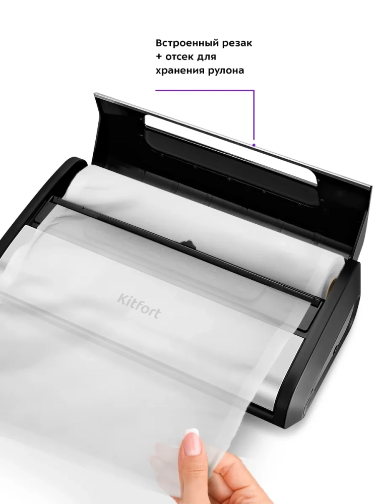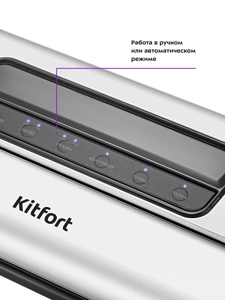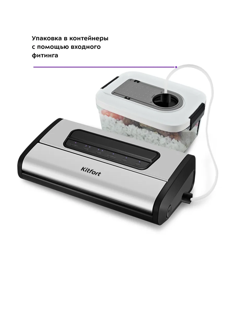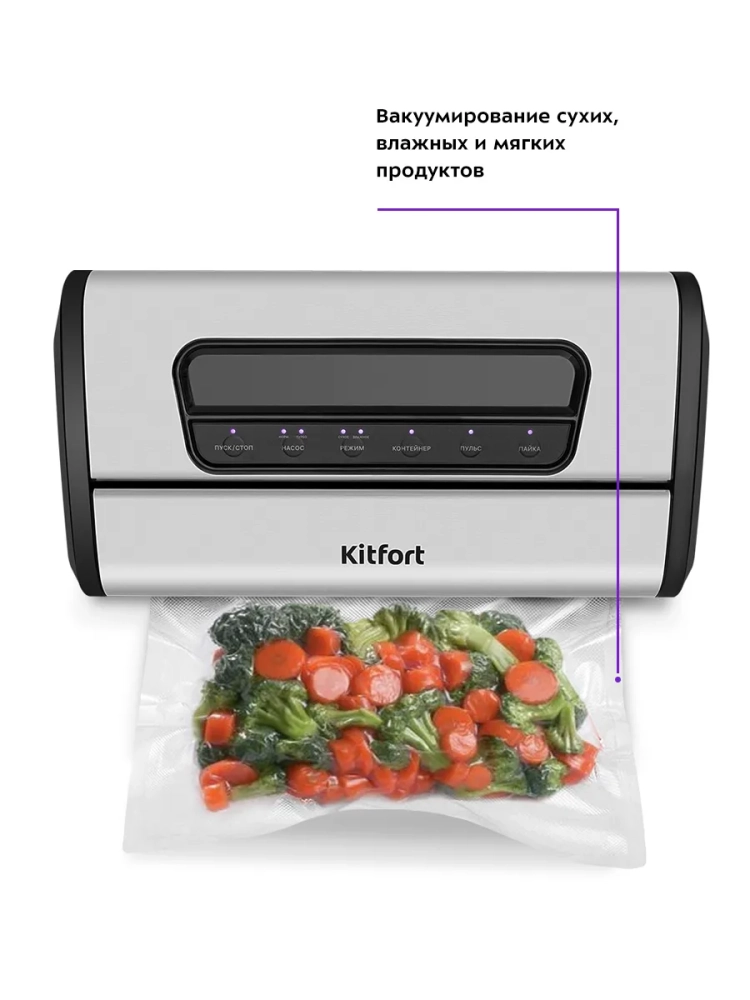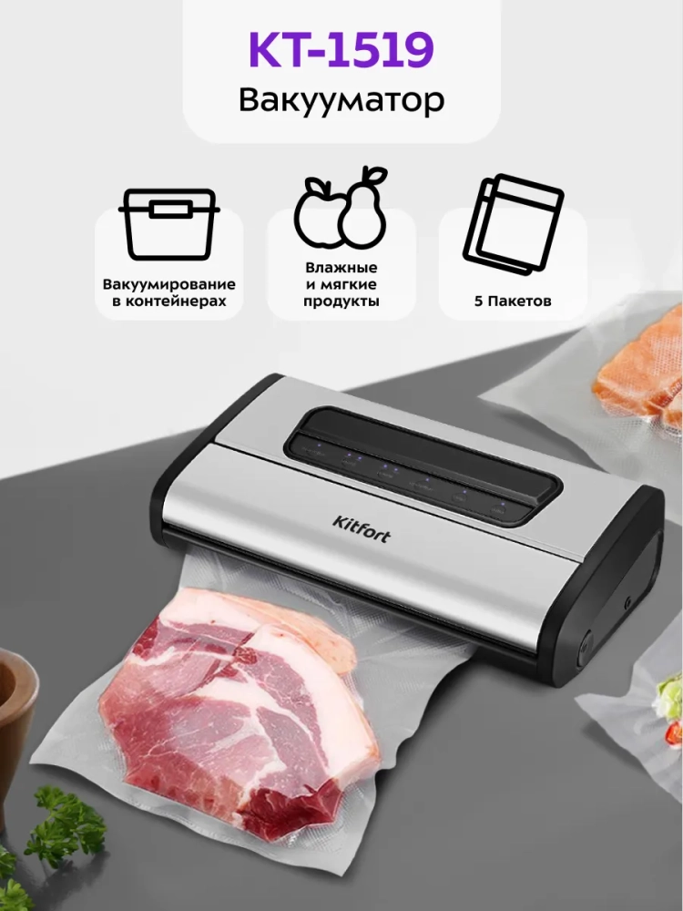 Вакууматор Kitfort КТ-1519 - устройство для вакуумной упаковки продуктов. Вакуумирование позволяет защитить от пыли, грязи, сохранить аромат и продлить сроки годности пищевых продуктов. Такой метод хранения уменьшает риск развития бактерий, которые появляются благодаря взаимодействию пищи с воздухом. Удаление воздуха из пакета гарантирует замедление процессов брожения, окисления и испарения, позволяя сохранить приятный внешний вид и качество самых разных продуктов питания. Вакууматор очень прост в использовании. Вакуумирование ускоряет засолку, маринование и мочение. В вакууме процесс обработки продуктов такими способами значительно ускоряется. Метод вакуумирования применяют не только в кулинарии, но и в других областях. Для туристических и бытовых нужд в вакуумный пакет можно поместить документы, деньги, спички, лекарства, мобильный телефон, карту, компас и другие предметы. Охотники могут запаковать порох и патроны. Это защитит их от сырости и попадания воды. Серебряные украшения, коллекционные монеты, значки, упакованные таким способом, не будут тускнеть со временем. Вакуумная упаковка продуктов и вещей помогает значительно сэкономить место как в холодильнике, чемодане, так и по всей квартире. Пакеты с откачанным воздухом и сжатым содержимым занимают гораздо меньше пространства. В KT-1519 есть режимы для вакуумирования сухих, влажных и мягких продуктов. Отдельный режим пайки позволить вам запечатать пакет без предварительной откачки воздуха, а импульсный режим, наоборот, откачает воздух из пакета без пайки. Понятная световая индикация сообщит о включении, смене и окончании выполняемого действия. Для вакуумирования контейнеров в КТ-1519 предусмотрен отдельный режим «Контейнер» — для откачки воздуха из емкостей. Прорезиненные ножки делают устройство более устойчивым и не дают скользить по столу во время работы.