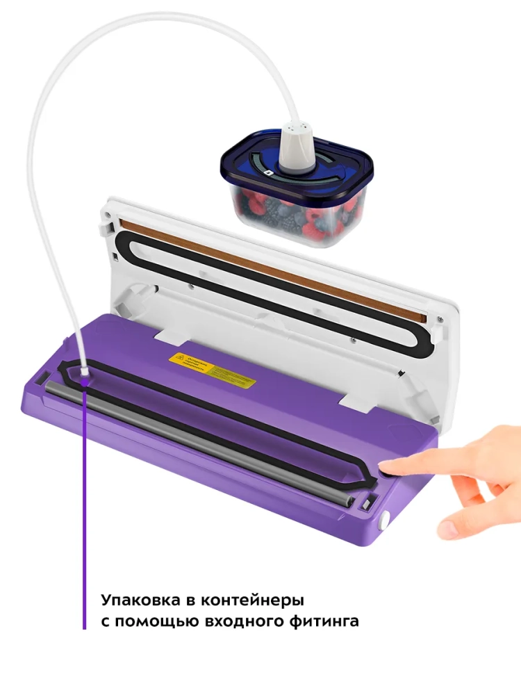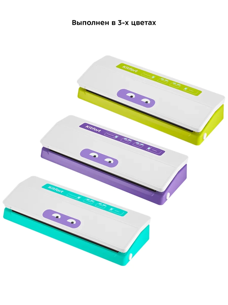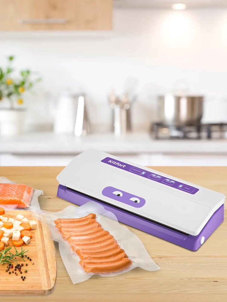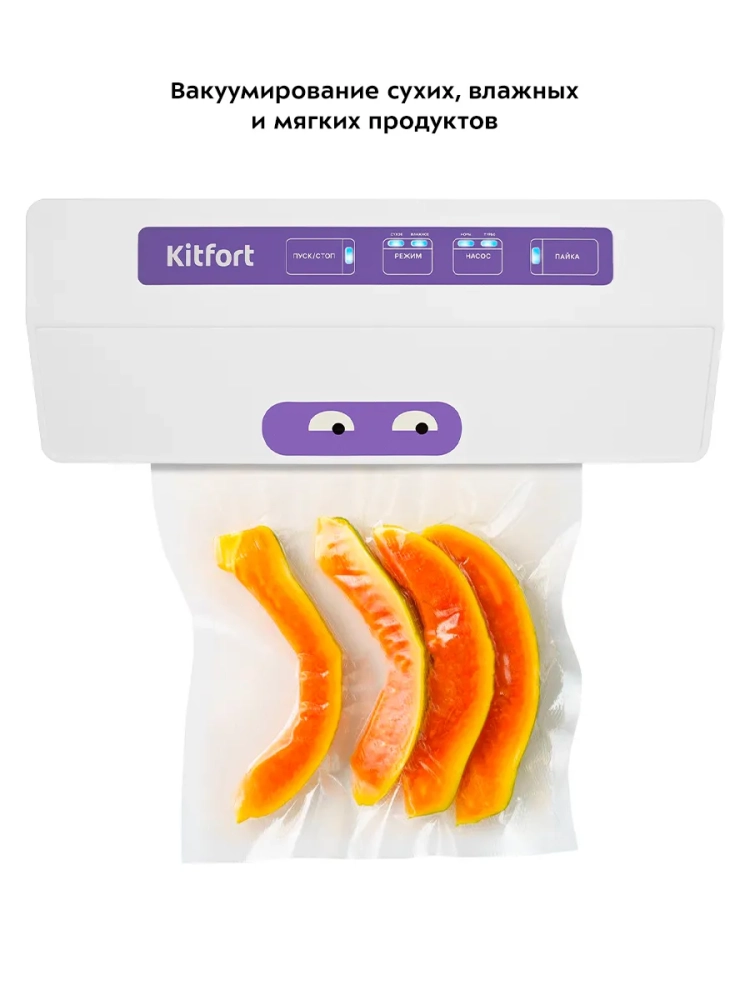 Вакууматор Kitfort КТ-1523 - устройство для вакуумной упаковки продуктов. Вакуумирование позволяет защитить от пыли, грязи, сохранить аромат и продлить сроки годности пищевых продуктов. Такой метод хранения уменьшает риск развития бактерий, которые появляются благодаря взаимодействию пищи с воздухом. Удаление воздуха из пакета гарантирует замедление процессов брожения, окисления и испарения, позволяя сохранить приятный внешний вид и качество самых разных продуктов питания. Вакууматор очень прост в использовании. Чтобы провести запаковку продукта, необходимо поместить его в специальный пакет, предназначенный для вакуумирования. Открытый край пакета укладывается в вакуумную камеру. После чего нужно закрыть крышку вакууматора и включить упаковку в автоматическом режиме. Вакууматор начинает выкачивать из пакета воздух. В результате образования вакуума пакет плотно обжимает содержимое. Как только воздух удален, начинается пайка открытой стороны пакета. В результате воздух уже не сможет проникнуть внутрь. Вакуумирование ускоряет засолку, маринование и мочение. В вакууме процесс обработки продуктов такими способами значительно ускоряется. Метод вакуумирования применяют не только в кулинарии, но и в других областях. Для туристических и бытовых нужд в вакуумный пакет можно поместить документы, деньги, спички, лекарства, мобильный телефон, карту, компас, чай и другие предметы. Охотники могут запаковать порох и патроны. Это защитит их от сырости и попадания воды. Серебряные украшения, коллекционные монеты, значки, упакованные таким способом, не будут тускнеть со временем. Вакуумная упаковка продуктов и вещей помогает значительно сэкономить место как в холодильнике, чемодане, так и по всей квартире. Пакеты с откачанным воздухом и сжатым содержимым занимают гораздо меньше пространства. В KT-1523 есть режимы для вакуумирования сухих, влажных или мягких продуктов. Прорезиненные ножки делают устройство более устойчивым и не дают скользить по столу во время работы.