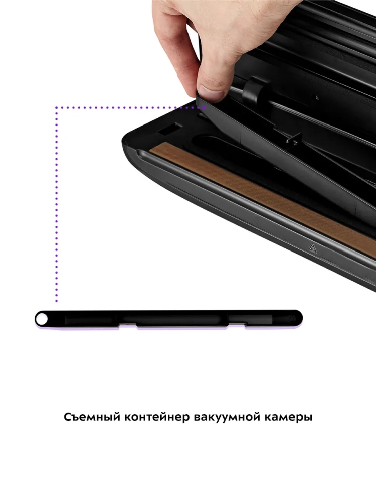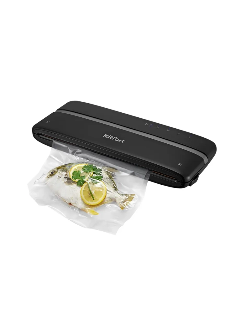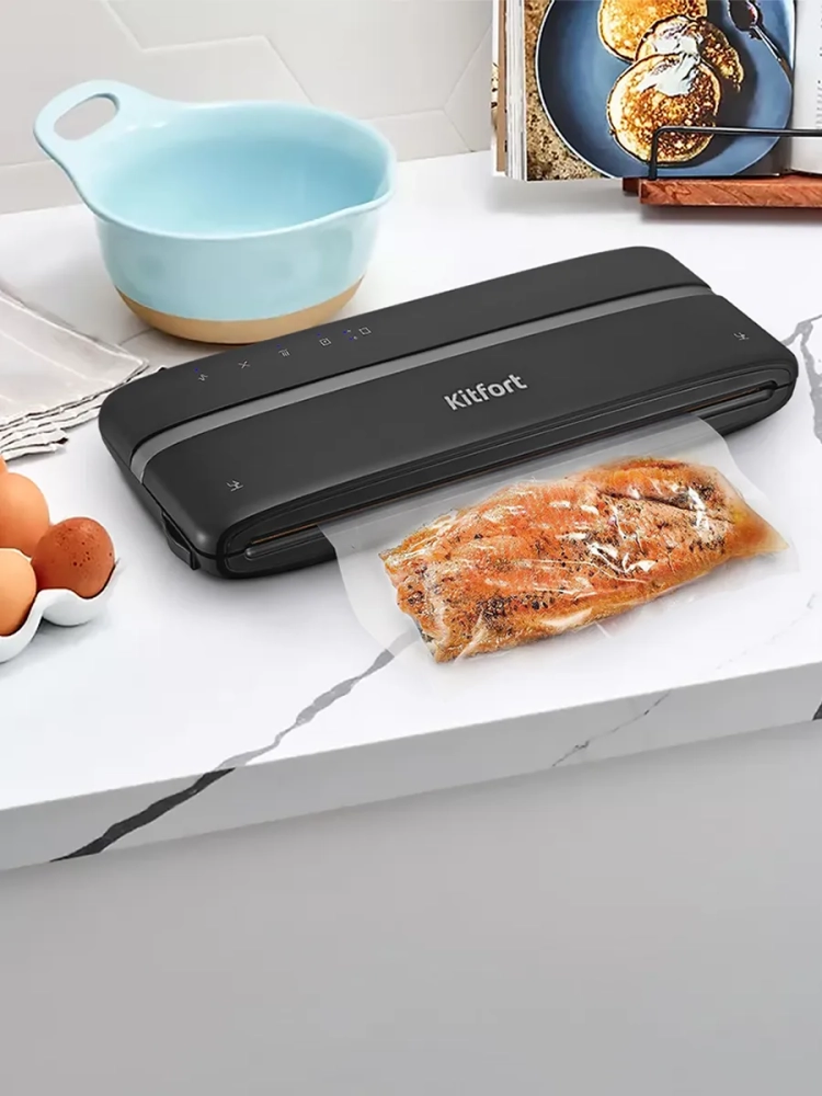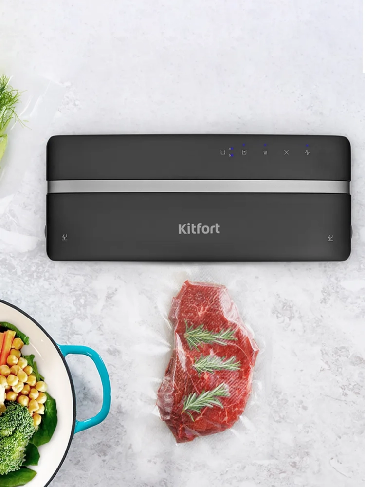 Вакууматор Kitfort КТ-1526 - устройство для вакуумной упаковки продуктов. Вакуумирование позволяет защитить от пыли, грязи, сохранить аромат и продлить сроки годности пищевых продуктов. Такой метод хранения уменьшает риск развития бактерий, которые появляются благодаря взаимодействию пищи с воздухом. Удаление воздуха из пакета гарантирует замедление процессов брожения, окисления и испарения, позволяя сохранить приятный внешний вид и качество самых разных продуктов питания. Вакууматор очень прост в использовании. Чтобы провести запаковку продукта, необходимо поместить его в специальный пакет, предназначенный для вакуумирования. Открытый край пакета укладывается в вакуумную камеру. После чего нужно закрыть крышку вакууматора и включить упаковку в автоматическом режиме. Вакууматор начинает выкачивать из пакета воздух. В результате образования вакуума пакет плотно обжимает содержимое. Как только воздух удален, начинается пайка открытой стороны пакета. В результате воздух уже не сможет проникнуть внутрь. Вакуумирование ускоряет засолку, маринование и мочение. В вакууме процесс обработки продуктов такими способами значительно ускоряется. Метод вакуумирования применяют не только в кулинарии, но и в других областях. Для туристических и бытовых нужд в вакуумный пакет можно поместить документы, деньги, спички, лекарства, мобильный телефон, карту, компас, чай и другие предметы. Охотники могут запаковать порох и патроны. Это защитит их от сырости и попадания воды. Серебряные украшения, коллекционные монеты, значки, упакованные таким способом, не будут тускнеть со временем. Вакуумная упаковка продуктов и вещей помогает значительно сэкономить место как в холодильнике, чемодане, так и по всей квартире. Пакеты с откачанным воздухом и сжатым содержимым занимают гораздо меньше пространства.
