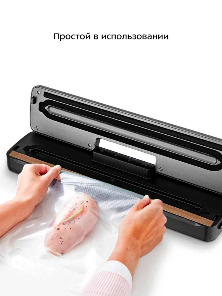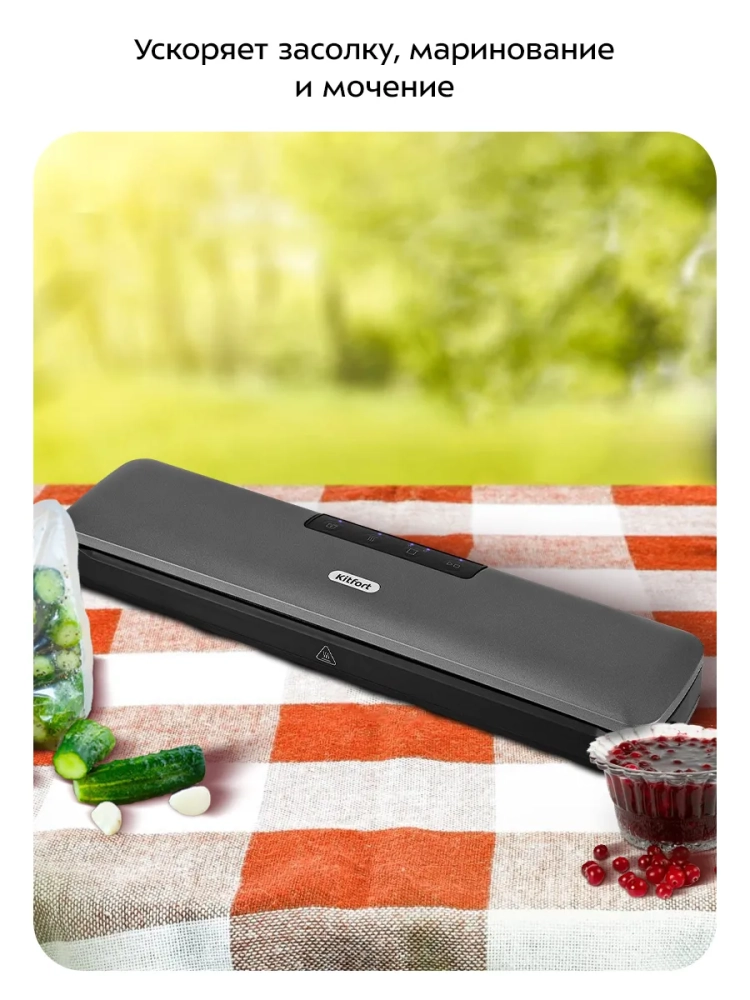 Вакууматор Kitfort КТ-1527 - устройство для вакуумной упаковки продуктов. Вакуумирование позволяет защитить от пыли, грязи, сохранить аромат и продлить сроки годности пищевых продуктов. Такой метод хранения уменьшает риск развития бактерий, которые появляются благодаря взаимодействию пищи с воздухом. Удаление воздуха из пакета гарантирует замедление процессов брожения, окисления и испарения, позволяя сохранить приятный внешний вид и качество самых разных продуктов питания. Вакууматор очень прост в использовании. Чтобы провести запаковку продукта, необходимо поместить его в специальный пакет, предназначенный для вакуумирования. Открытый край пакета укладывается в вакуумную камеру. После чего нужно закрыть крышку вакууматора и включить упаковку в автоматическом режиме. Вакууматор начинает выкачивать из пакета воздух. В результате образования вакуума пакет плотно обжимает содержимое. Как только воздух удален, начинается запечатывание открытой стороны пакета. В результате воздух уже не сможет проникнуть внутрь. Вакуумирование ускоряет засолку, маринование и мочение. В вакууме процесс обработки продуктов такими способами значительно ускоряется. Метод вакуумирования применяют не только в кулинарии, но и в других областях. Для туристических и бытовых нужд в вакуумный пакет можно поместить документы, деньги, спички, лекарства, мобильный телефон, карту, компас, чай и другие предметы. Охотники могут запаковать порох и патроны. Это защитит их от сырости и попадания воды. Серебряные украшения, коллекционные монеты, значки, упакованные таким способом, не будут тускнеть со временем. В KT-1527 есть режимы для вакуумирования сухих и влажных продуктов. Отдельный режим запечатывания позволит вам запечатать пакет без предварительной откачки воздуха, а импульсный режим, наоборот, откачает воздух из пакета без запечатывания. Прорезиненные ножки делают устройство более устойчивым и не дают скользить по столу во время работы.