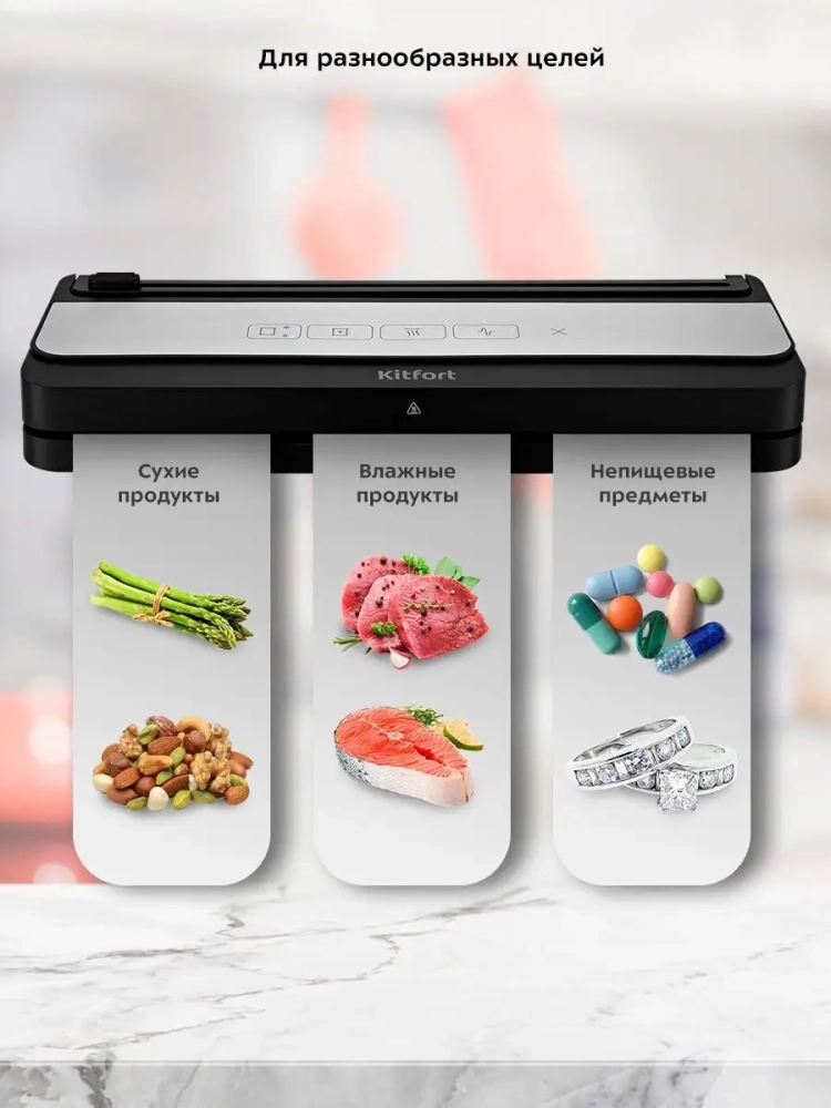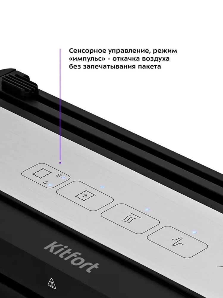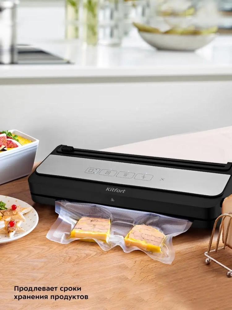 Вакууматор Kitfort КТ-1533 — устройство для вакуумной упаковки продуктов. Вакуумирование позволяет защитить от пыли, грязи, сохранить аромат и продлить сроки годности пищевых продуктов. Такой метод хранения уменьшает риск развития бактерий, которые появляются благодаря взаимодействию пищи с воздухом. Удаление воздуха из пакета гарантирует замедление процессов брожения, окисления и испарения, позволяя сохранить приятный внешний вид и качество самых разных продуктов питания. Вакууматор очень прост в использовании. Чтобы провести запаковку продукта, необходимо поместить его в специальный пакет, предназначенный для вакуумирования. Открытый край пакета укладывается в вакуумную камеру. После чего нужно закрыть крышку вакууматора и включить упаковку в автоматическом режиме. Вакууматор начинает выкачивать из пакета воздух. В результате образования вакуума пакет плотно обжимает содержимое. Как только воздух удален, начинается запечатывание открытой стороны пакета. В результате воздух уже не сможет проникнуть внутрь. Вакуумная упаковка продуктов и вещей помогает значительно сэкономить место как в холодильнике, чемодане, так и по всей квартире. Пакеты с откачанным воздухом и сжатым содержимым занимают меньше пространства. У KT-1533 есть режимы для вакуумирования сухих и влажных продуктов. Отдельный режим запечатывания позволит вам запечатать пакет без предварительной откачки воздуха. Понятная световая индикация сообщит о включении, смене и окончании выполняемого действия. Режим «Импульс» поможет откачать нужный объем воздуха, без последующего запечатывания пакета. Для вакуумирования контейнеров в комплекте к устройству идет шланг с двумя насадками для двух видов самых распространенных фитингов контейнеров. Прорезиненные ножки делают устройство более устойчивым и не дают скользить по столу во время работы.