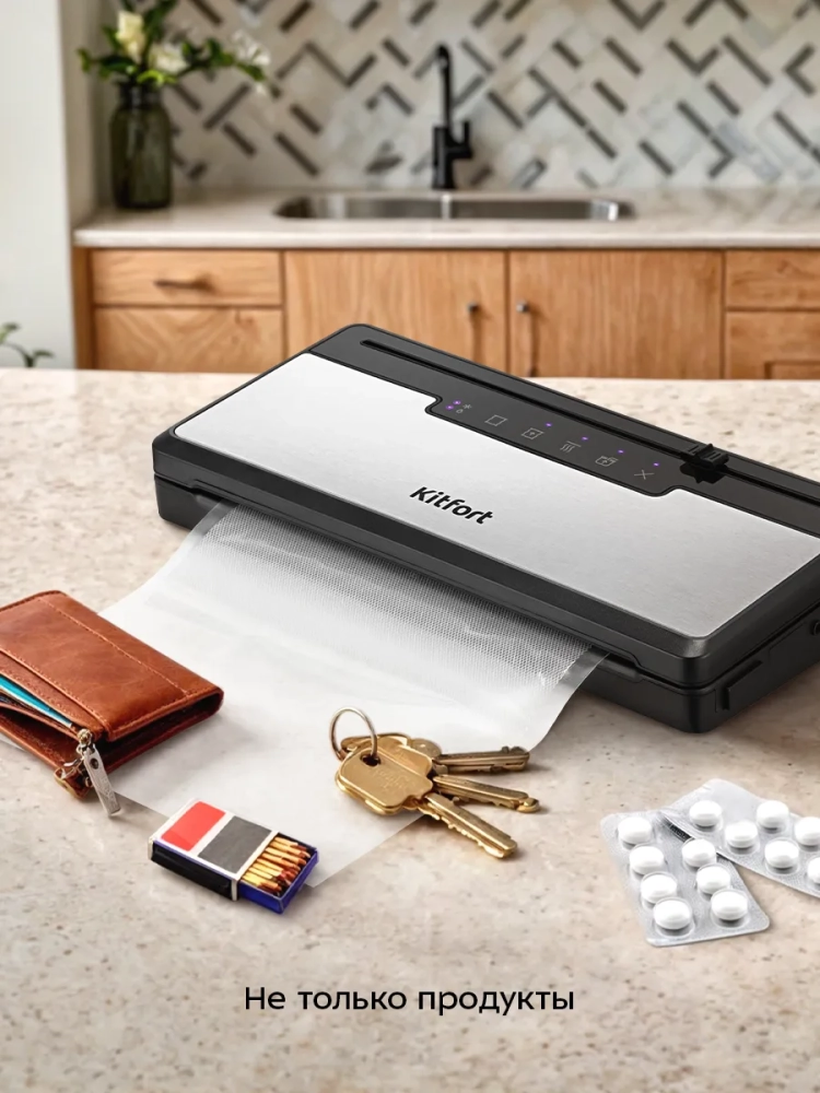 Вакууматор Kitfort КТ-1555 — устройство для вакуумной упаковки продуктов. Вакуумирование позволяет защитить от пыли, грязи, сохранить аромат и продлить срок годности пищевых продуктов. Такой метод хранения уменьшает риск развития бактерий, которые появляются из-за взаимодействия пищи с воздухом. Удаление воздуха из пакета гарантирует замедление процессов брожения, окисления и испарения, позволяя сохранить приятный внешний вид и качество самых разных продуктов питания. Вакуумирование значительно ускоряет засолку и маринование.