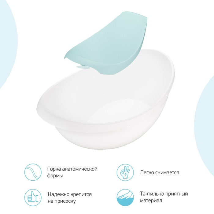 Детская ванночка для купания новорожденных и малышей превратит водные процедуры в любимую процедуру ваших детей. В первые месяцы вы сможете купать новорожденного малыша в положении лежа с помощью анатомической горки. Когда малыш подрастет и начнет сидеть самостоятельно, горку можно будет снять, после чего противоположная стенка ванночки станет удобной спинкой для поддержки ребенка. Съемная горка оснащена присоской. Противоскользящие накладки в основании ванночки гарантируют устойчивость на разных поверхностях. Обтекаемая форма лодочки без острых углов исключает возможность травмирования. Приятная на ощупь поверхность, которая препятствует скольжению тела ребенка. Благодаря компактному размеру ванночку можно разместить в ванной, душевой кабине или на полу. Изготовлено из высококачественного полипропилена с пищевым допуском, который не содержит токсичных примесей и не пахнет. Можно использовать с рождения до 18 месяцев. Размеры ванночки представлены на фотографиях.
