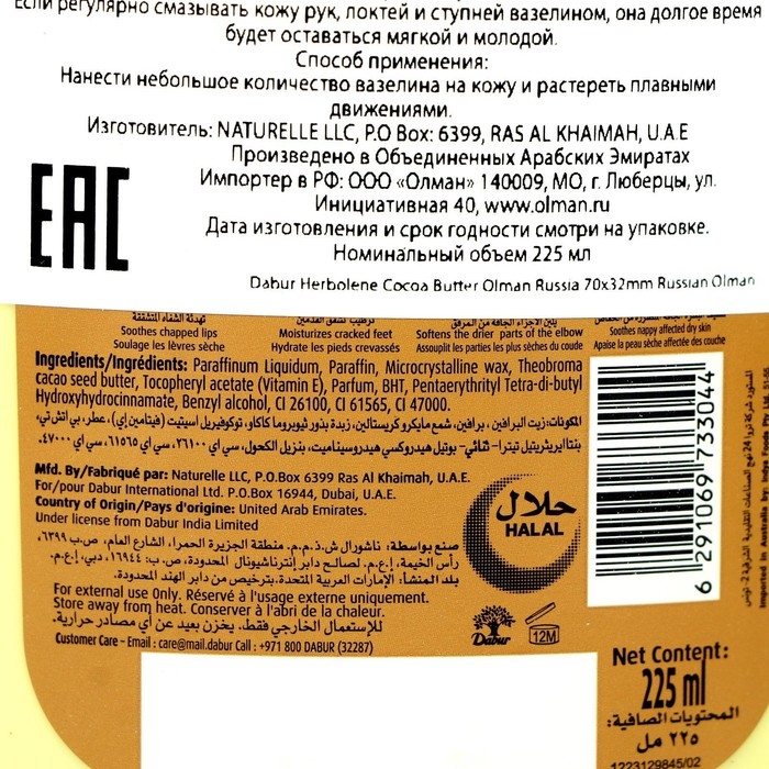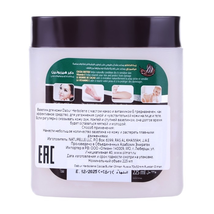 Вазелин для кожи Dabur Herbolene с маслом какао и витамином Е, увлажняющий, 225 мл