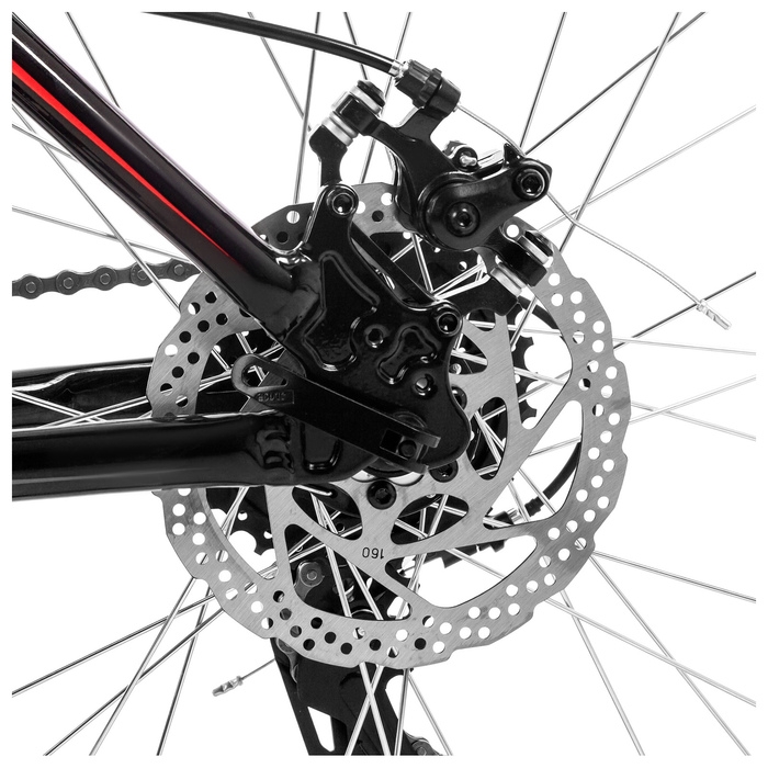 Горный велосипед подходит для передвижения по улицам города и бездорожью. Изделие оснащено дисковыми тормозами, которые обеспечивают надёжное и безопасное торможение в любых условиях. На передней части велосипеда есть амортизационная вилка для комфортной езды по неровной дороге.