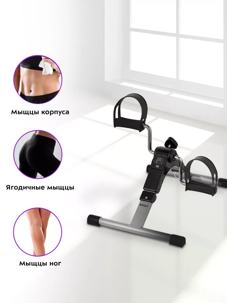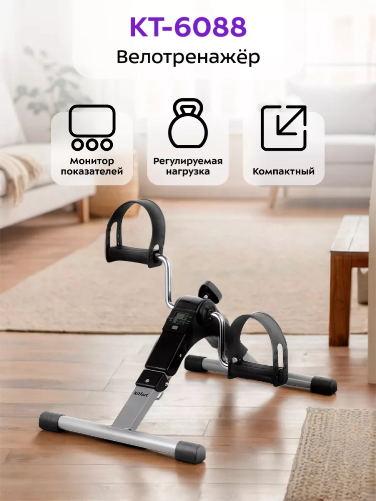 Велотренажер Kitfort KT-6088 — отличная альтернатива велосипеду. Теперь вам не нужно ждать хорошей погоды, ведь велотренажер можно использовать дома! Велотренажер имеет небольшой размер, поэтому его можно поставить в любое удобное для вас место. Велотренажер оказывает положительное влияние на организм человека. При регулярных тренировках на тренажере повышается выносливость, подвижность суставов, улучшается форма бедер и живота, мышцы ног становятся более развитыми. Занятия на велотренажере улучшают работу сердца, сердечно-сосудистой и дыхательной систем. Кроме того, занятия на велотренажере в умеренном темпе под любимую музыку помогут снизить уровень стресса и расслабиться в конце дня. Также при правильном питании и регулярных нагрузках велотренажер помогает сбросить лишний вес. KT-6088 позволяет регулировать сопротивление педалей, плавно изменяя нагрузку при необходимости. Чем выше сопротивление педалей, тем труднее крутить их. Нагрузку можно регулировать во время занятия. На мониторе велотренажера отображаются параметры тренировки: длительность тренировки, количество оборотов педалей в минуту, суммарное количество оборотов педалей и количество сожженных калорий. Это позволит вам контролировать нагрузку во время тренировки и ее длительность. Велотренажер Китфорт KT-6088 не занимает много места в квартире. Складная конструкция устройства позволяет сэкономить место при хранении.