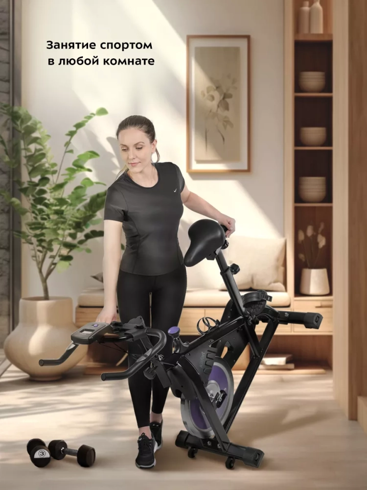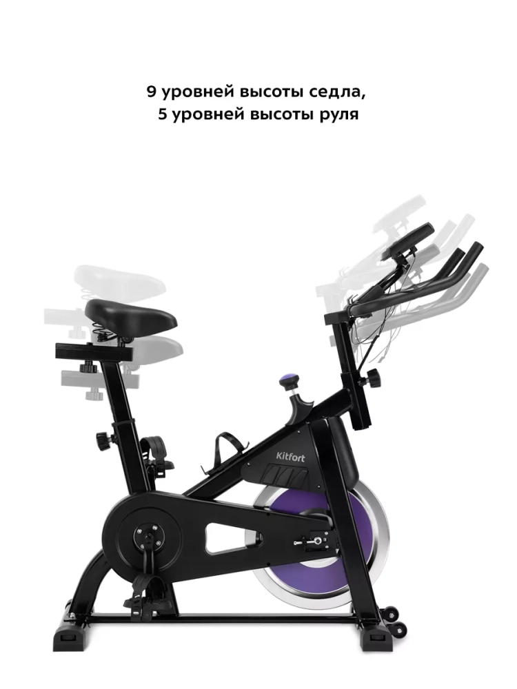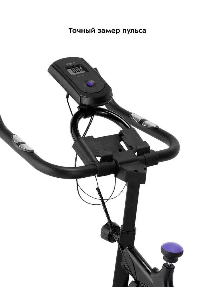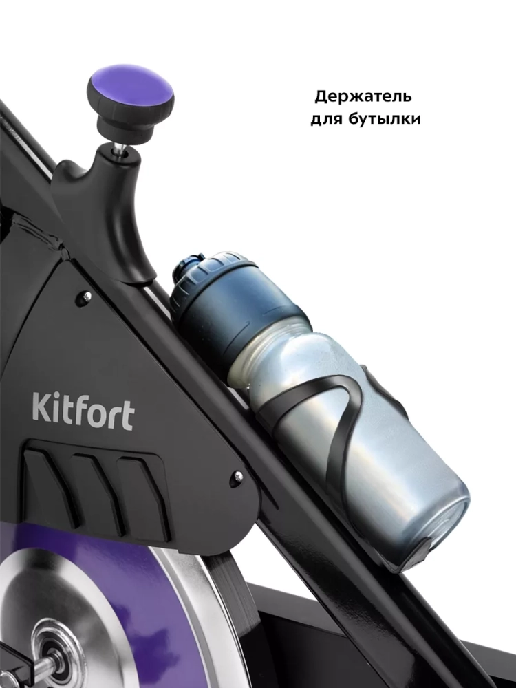 Велотренажер Китфорт KT-6085 оснащен колесиками, чтобы вы могли легко перемещать его. Также тренажер оборудован держателем бутылки для воды и подставкой для телефона на руле, куда вы можете установить смартфон во время тренировки.