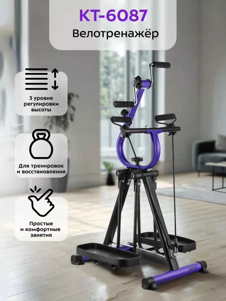 Основное преимущество велотренажера КТ-6087 в том, что тренироваться на нем очень комфортно. Все упражнения выполняются, сидя на стуле. Так вы сможете проводить тренировку даже после тяжелого рабочего дня, например, во время просмотра любимого фильма.