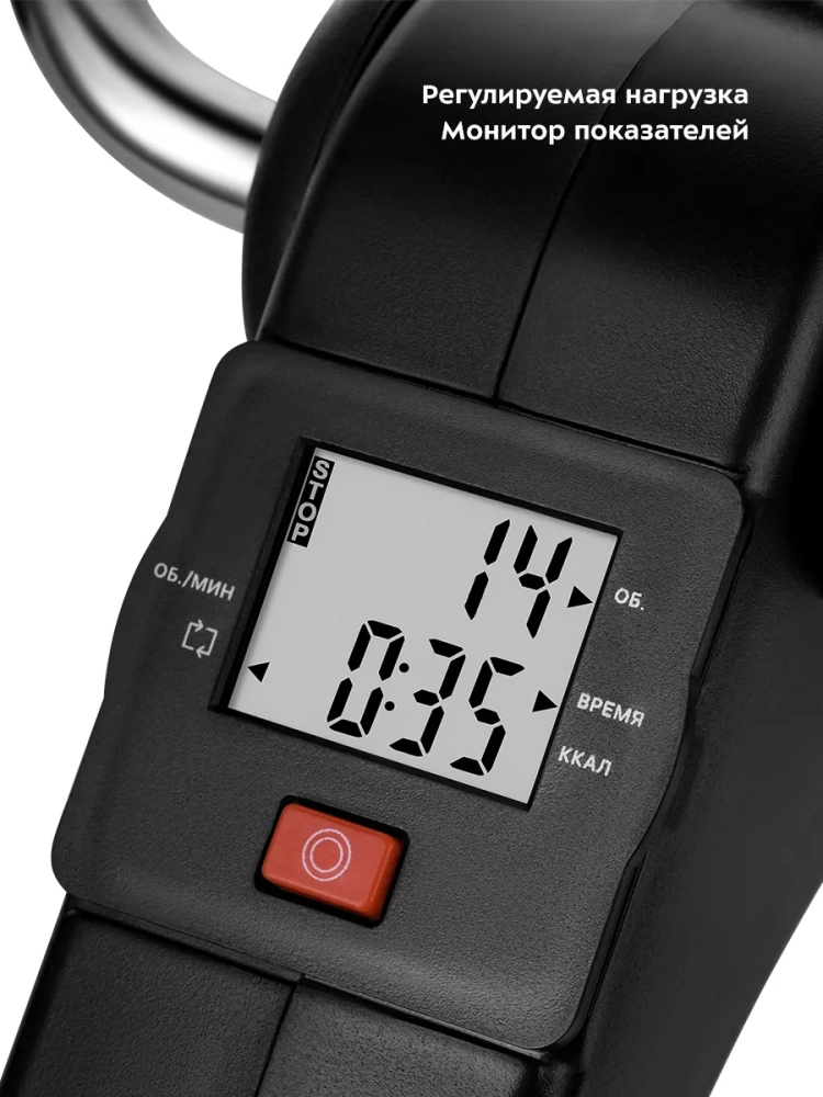 В комплекте к велотренажеру идет монитор, на котором отображаются параметры тренировки: длительность тренировки, количество оборотов педалей в минуту, суммарное количество оборотов педалей и количество сожженных калорий. Это позволит вам контролировать нагрузку во время тренировки и ее длительность.