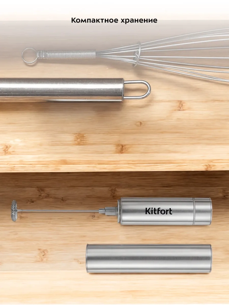 Венчик для взбивания Kitfort КТ-7468 предназначен для вспенивания молока. Внутри венчика есть маленький моторчик, который работает от 2 батареек типоразмера AA (батарейки в комплект не входят). Заряда батареек хватит на длительное время эксплуатации устройства. Пользоваться прибором очень просто: налейте молоко в кружку, поместите в нее венчик и нажмите на кнопку включения. Венчик для взбивания занимает очень мало места и удобен в использовании. Также в комплекте есть подставка для хранения. Питание: =4,5 В (3 элемента ААА x 1,5 В). Класс защиты от поражения электрическим током: III. Размер устройства: 30 х 30 x 237 мм.