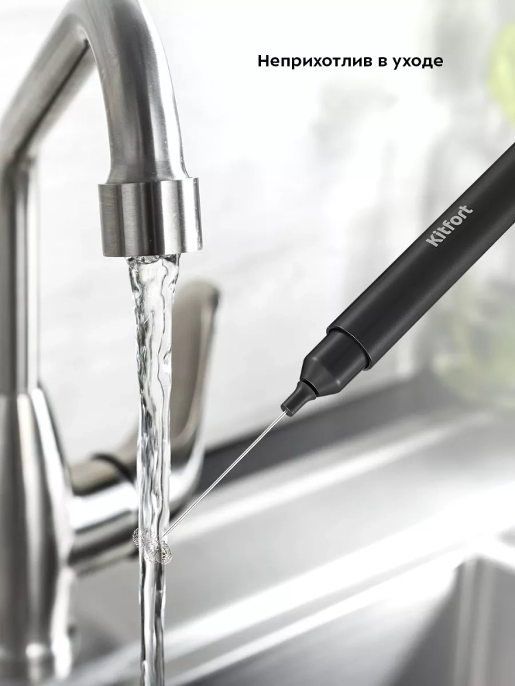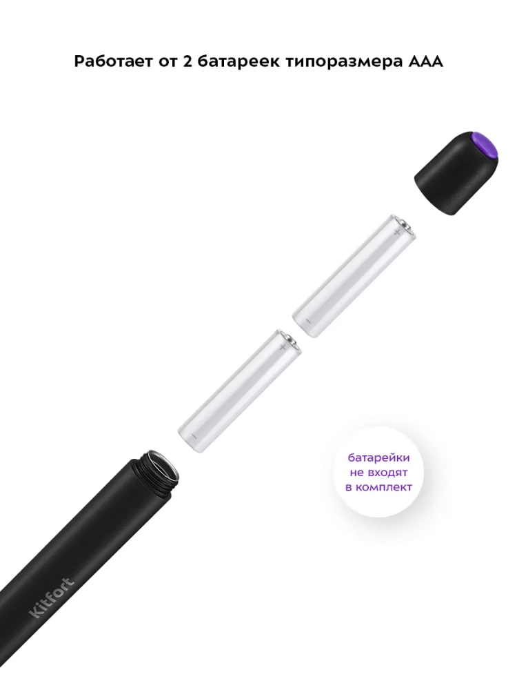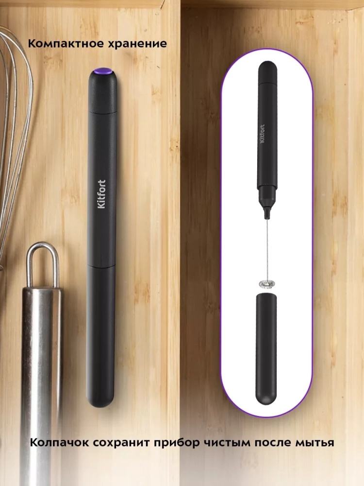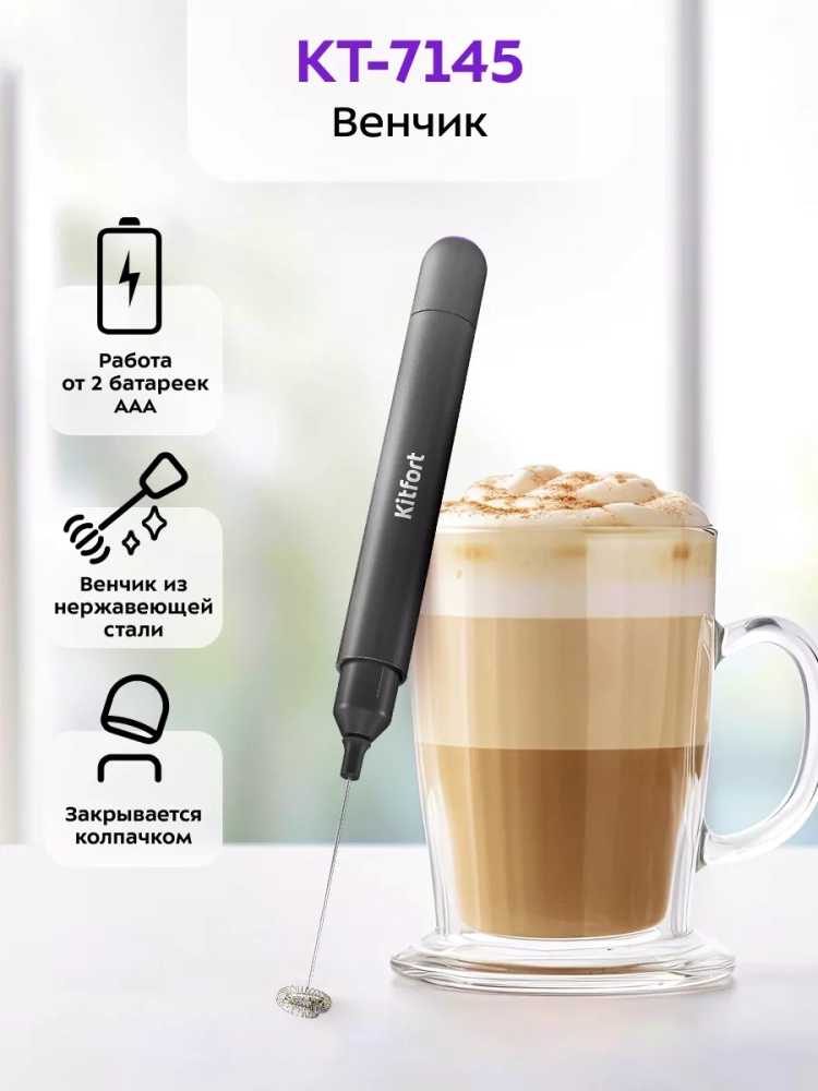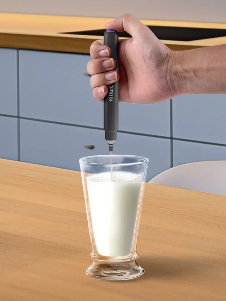 Венчик для взбивания Kitfort КТ-7145 предназначен для вспенивания молока. Внутри венчика есть маленький моторчик, который работает от 2 батареек типоразмера AAA (батарейки в комплект не входят). Заряда батареек хватит на длительное время эксплуатации венчика. Пользоваться прибором очень просто: налейте молоко в кружку, поместите в нее венчик и нажмите на кнопку включения. Венчик взбивает теплое молоко не дольше чем за 30 секунд. Венчик для взбивания занимает очень мало места и удобен в использовании.