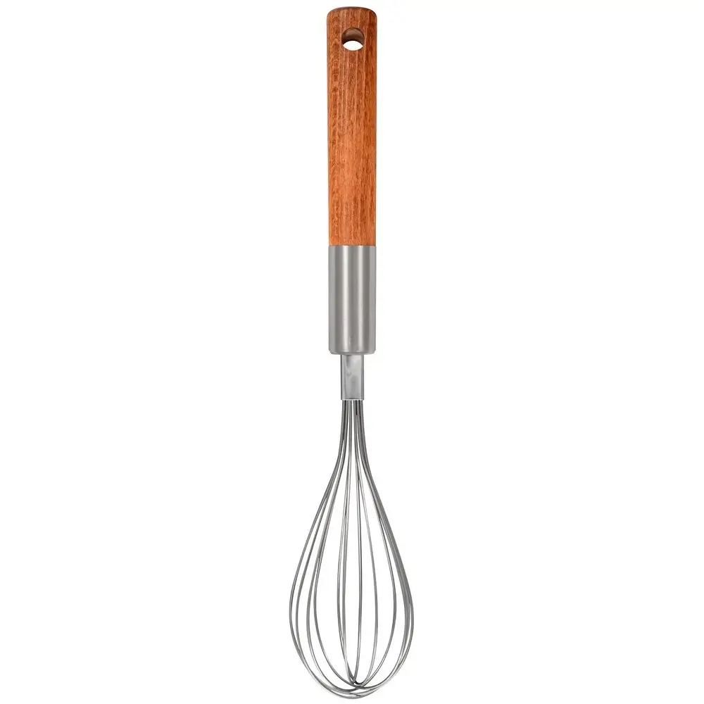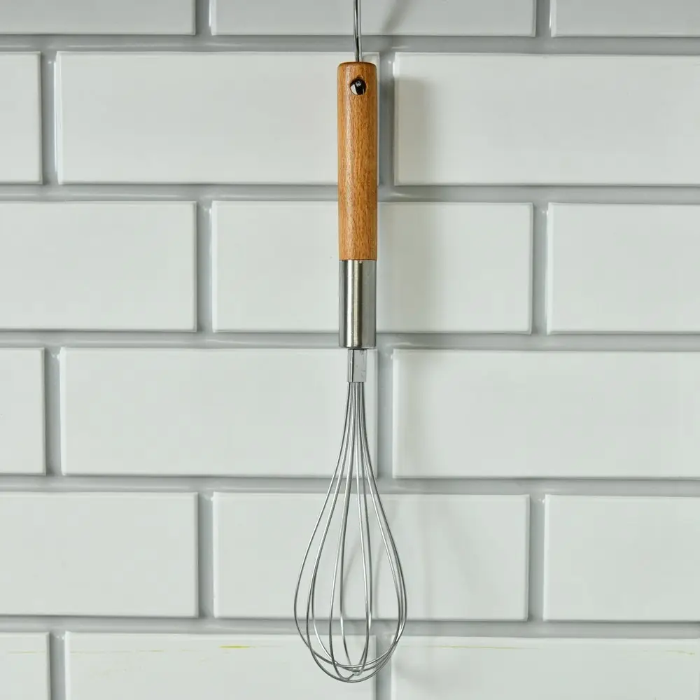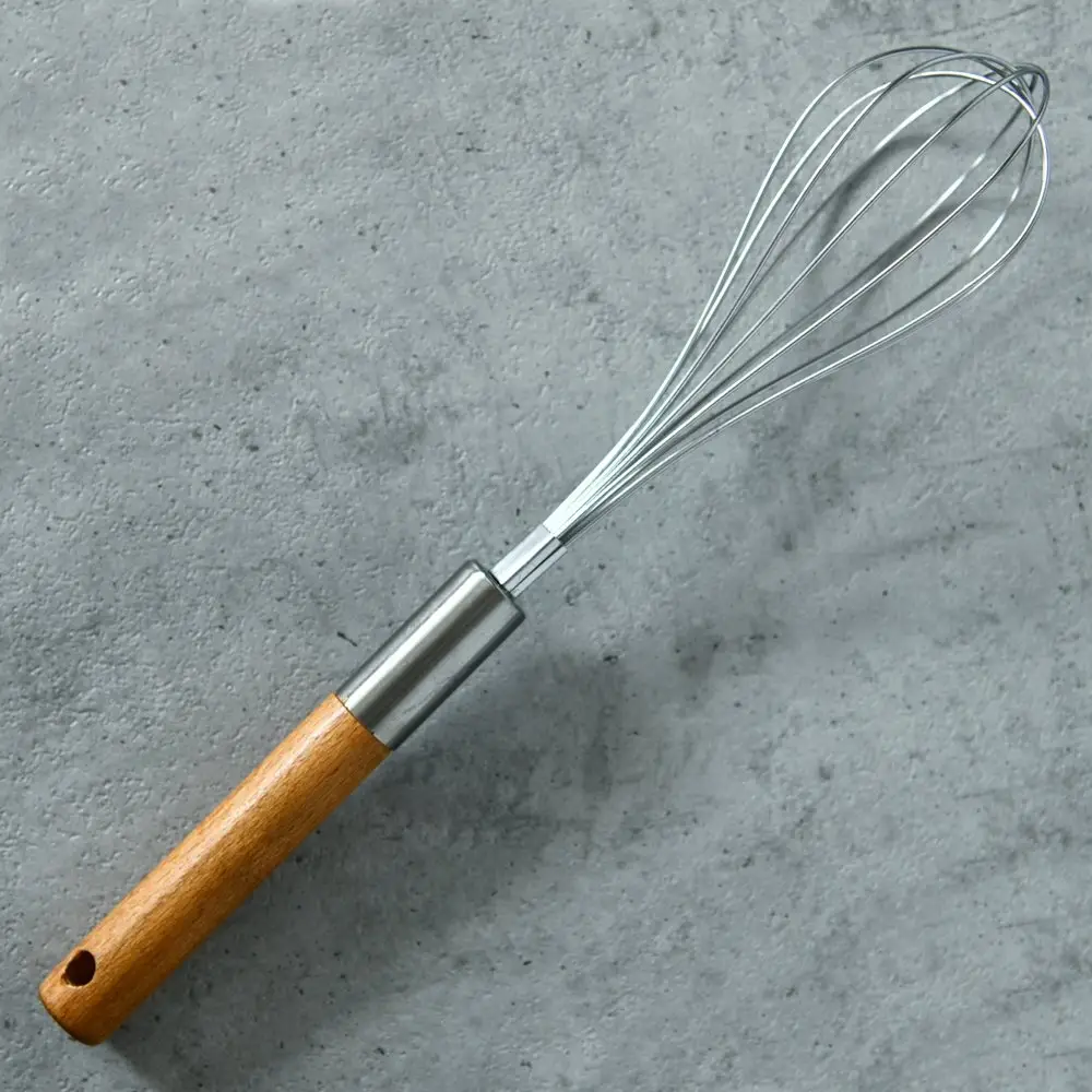 Применяется для взбивания яиц при приготовлении пищи и перемешивания жидкого теста. Перед первым использованием и после каждого применения промыть мягкой щеткой или губкой с жидким моющим средством, сполоснуть и просушить. Хранить в сухом месте. Изготовлено: рабочая часть из коррозионностойкой (нержавеющей) стали, ручка из дерева. Общая длина 30 см.