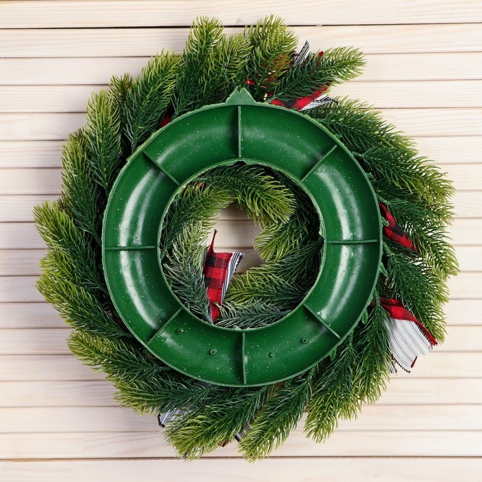 Венок новогодний d- 36 см "Уютная сказка" клетчатые ленты алые шары