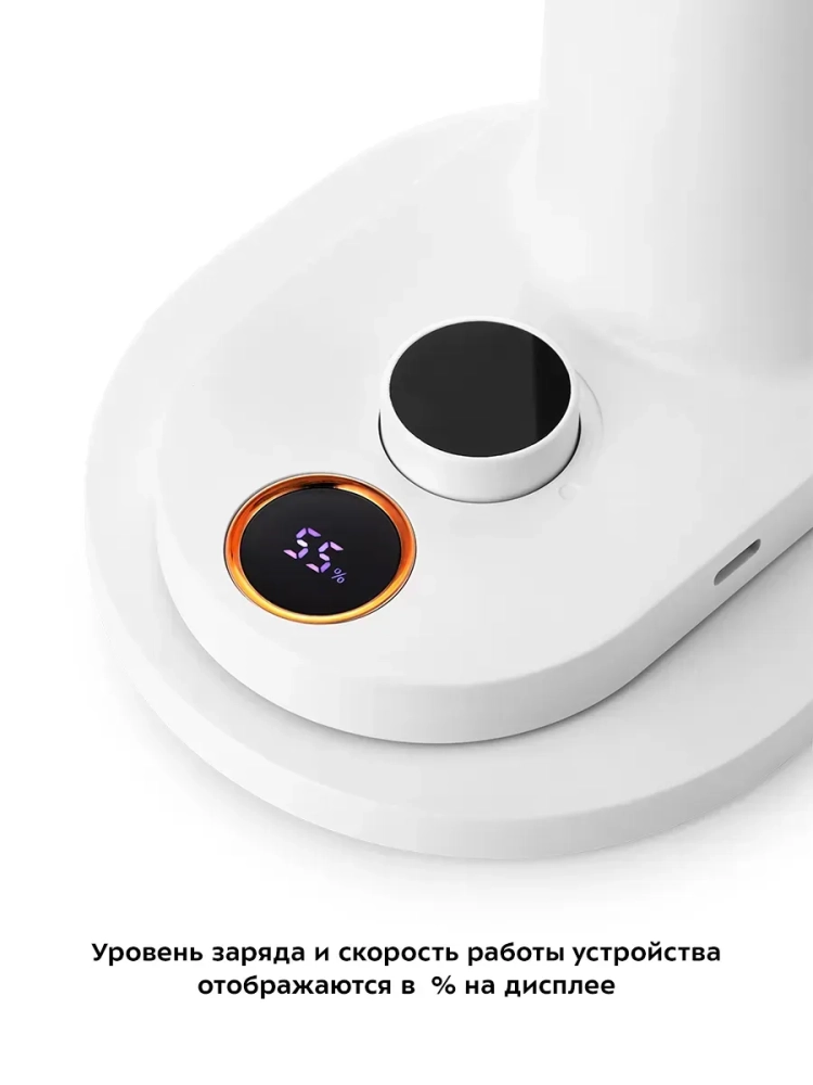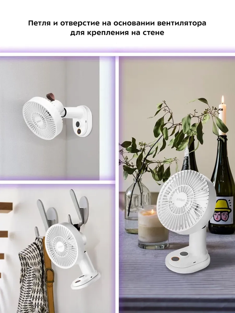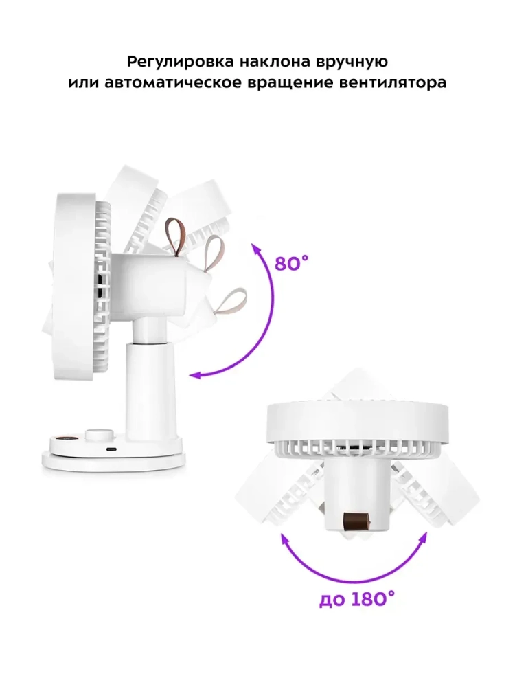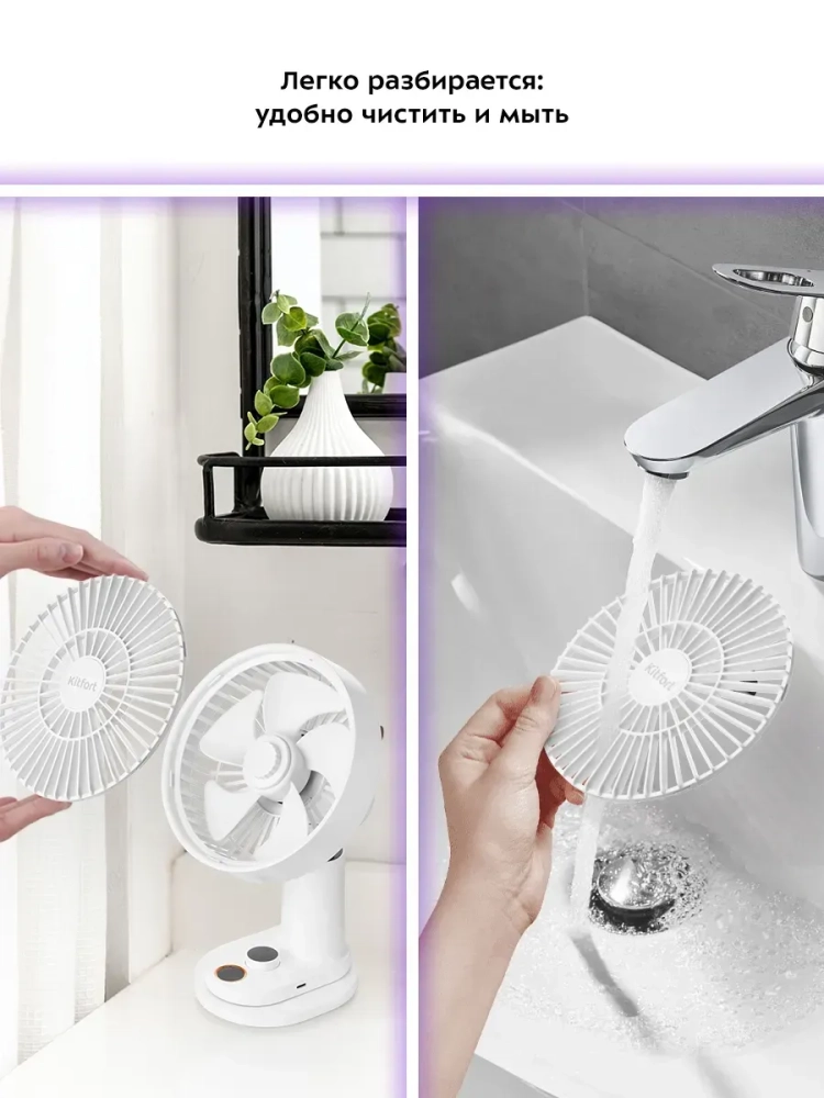 Беспроводной вентилятор Kitfort КТ-418 - маленький портативный прибор, работающий от аккумулятора. Благодаря этим качествам он станет незаменимым помощником на прогулке или пикнике в жаркий день, ведь его можно переносить куда угодно. Вам больше не придется спасаться от знойной жары, сидя дома под кондиционером. Потоки свежего воздуха можно взять с собой! Вентилятор маленький и легкий, он поместится даже в сумку, а благодаря эргономичной ручке его удобно носить с собой на улице. Вентилятор также можно использовать в помещении. Если потянуть основание вниз, то образуется прищепка для стола, поэтому вы можете прикрепить его к краю столешницы, отрегулировав нужное расстояние по высоте столешницы. Прибор создаст комфортный прохладный ветерок, избавит от духоты, не позволит воздуху застаиваться. У устройства простое и надежное управление одной кнопкой, но управлять можно и при помощи пульта дистанционного управления. Дисплей покажет вам уровень оставшегося заряда и скорость работы в процентах. Вы сможете выбрать более комфортный для себя вариант: легкий освежающий бриз или сильный поток воздуха. Регулировка наклона позволяет изменять направление, в котором движется воздушный поток. Угол наклона можно регулировать вручную в горизонтальной и вертикальной плоскости. Также можно включить автоматическое вращение в горизонтальной плоскости. Съемная передняя решетка позволяет легко очищать устройство при необходимости. На задней части вентилятора есть прочная петля из искусственной кожи. За петлю вентилятор можно вешать на стену на крючок. Также на нижней части основания есть отверстие для крепления вентилятора на стену.