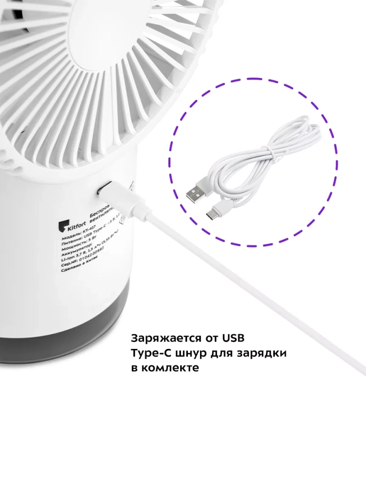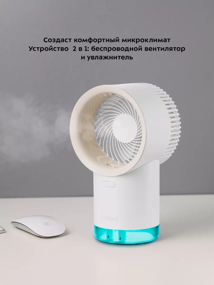 Беспроводной вентилятор-увлажнитель Kitfort КТ-417 - компактный портативный прибор, работающий от аккумулятора. Благодаря этим качествам он станет незаменимым помощником на прогулке или пикнике в жаркий день, ведь его можно переносить куда угодно. Вам больше не придется спасаться от знойной жары, сидя дома под кондиционером. Потоки свежего воздуха можно взять с собой! Вентилятор также можно использовать в помещении. Прибор создаст комфортный прохладный ветерок, избавит от духоты, не даст воздуху застаиваться. При этом можно заниматься любыми домашними делами, поставив устройство на ровную поверхность. Китфорт KT-417 имеет функцию увлажнения. Ультразвуковые увлажнители считаются наиболее эффективными из существующих увлажнителей воздуха. Принцип работы такого увлажнителя прост: внутри него стоит пьезокерамический излучатель, погруженный в воду, который с помощью ультразвуковых колебаний выбивает с поверхности воды мельчайшие капельки воды, создавая водяной туман. Этот туман выдувается наружу, а затем частицы воды разносятся по объему помещения потоками воздуха от включенного вентилятора. Совмещенный вентилятор и увлажнитель воздуха — идеальное сочетание для создания хорошего микроклимата для человека. У устройства простое и надежное управление. Есть три скорости работы, так что вы сможете выбрать комфортный для себя вариант: легкий освежающий бриз или более сильный поток. Лопасти вентилятора закрыты решеткой для безопасности. Световая индикация при работе подсвечивает весь резервуар для воды, она плавно меняет цвета, создавая красивую уютную атмосферу.