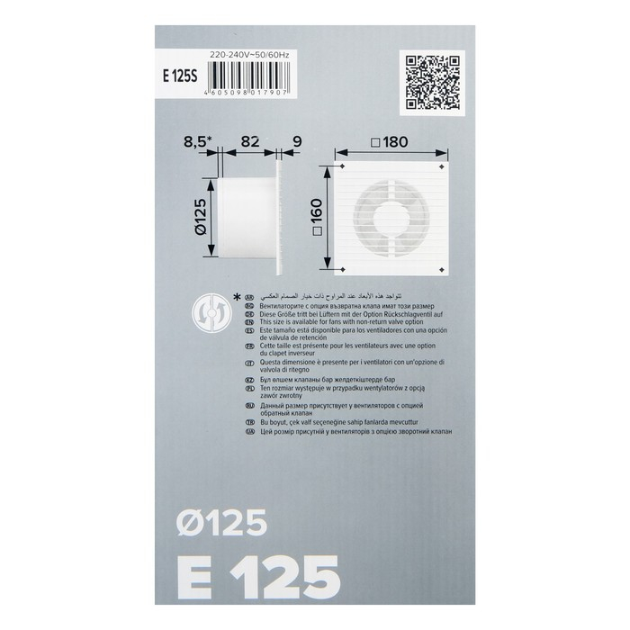 Вентилятор вытяжной ERA E 125 S, 180x180 мм, d=125 мм, 220‒240 В
