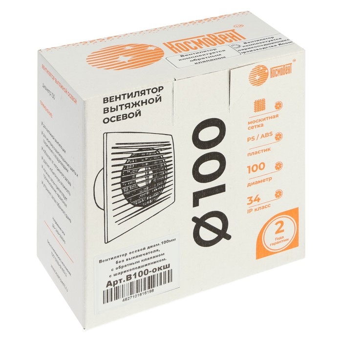 Вентилятор вытяжной "КосмоВент" В100-окш, d=100 мм, 144 м³/ч, без выключ, обр клапан, подш
