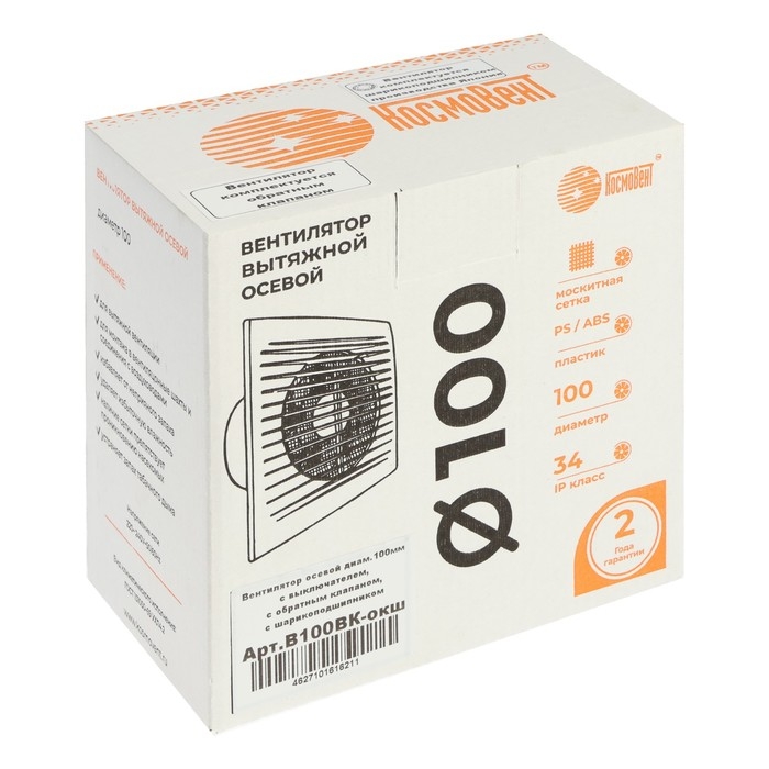 Вентилятор вытяжной "КосмоВент" В100ВК-окш, d=100 мм, 144 м³/ч, с выключ, обр клапан, подш