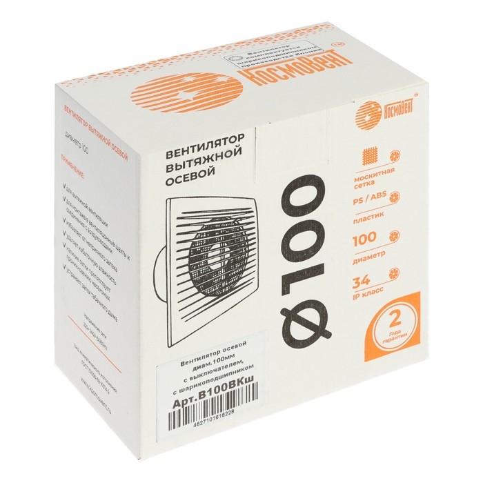 Вентилятор вытяжной "КосмоВент" В100ВКш, d=100 мм, 10 Вт, 144 м³/ч, с выключ, подшипник