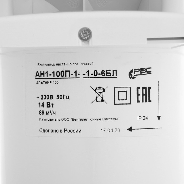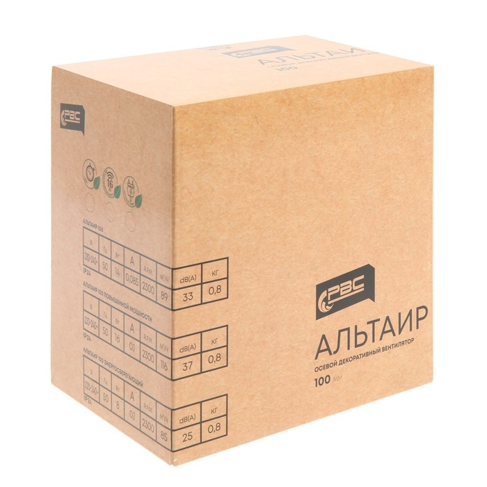 Вентилятор вытяжной "РВС" Альтаир 100, d=100 мм, 14 Вт, 33 дБ, 89 м3/ч, белый