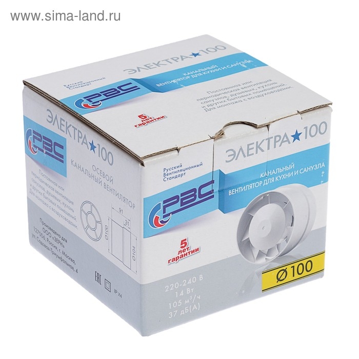 Вентилятор вытяжной "РВС" Электра 100, d=100 мм, 14Вт, 36 дБ, 104 м3/ч, канальный, белый