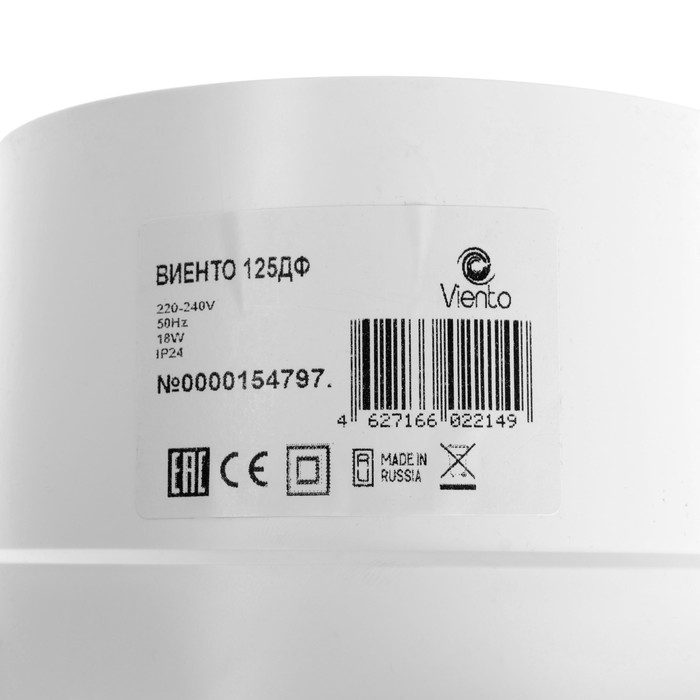 Вентилятор вытяжной "ВИЕНТО" 125ДФ, d=125 мм, 18 Вт, 140 м³/ч, 34 дБ, белый