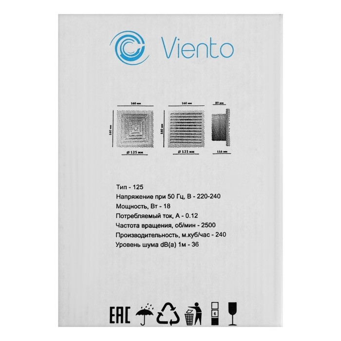 Вентилятор вытяжной "ВИЕНТО" 125ВФ, d=125 мм, 18 Вт, 240 м³/ч, 34 дБ, белый
