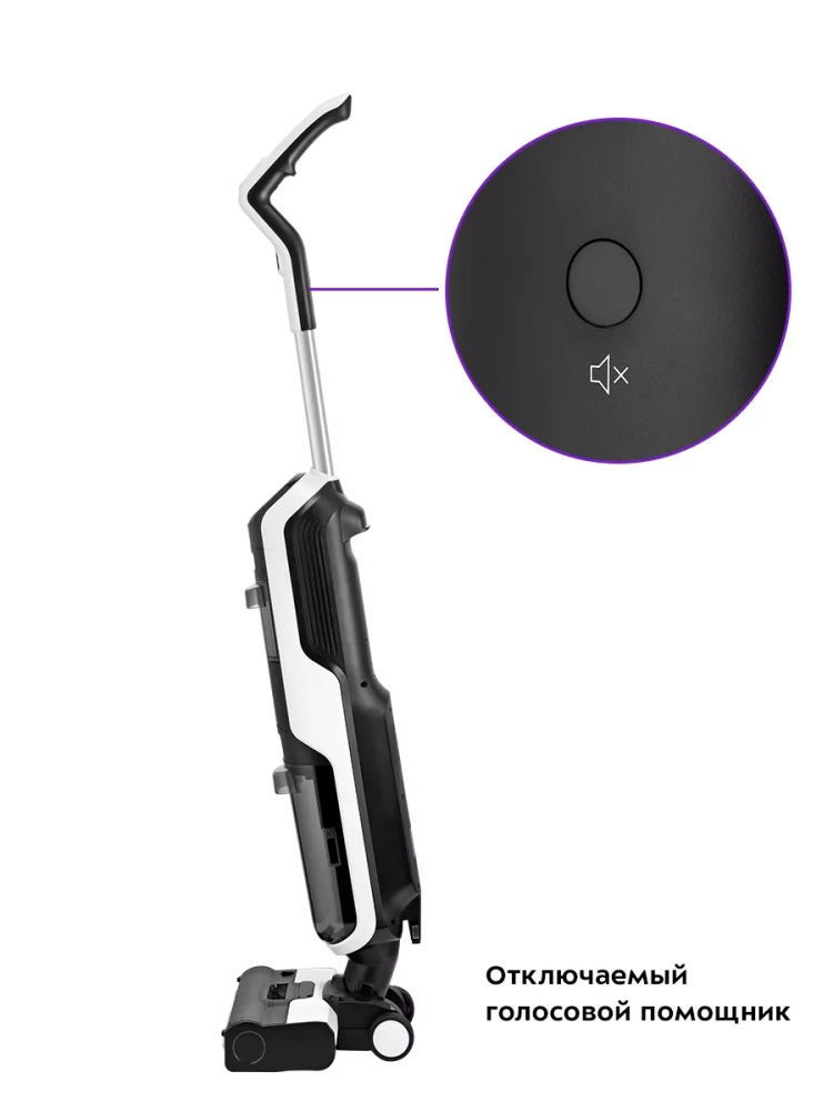 В данном приборе есть голосовой помощник, который подскажет вам действия с пылесосом. Данную функцию при желании можно отключить с помощью кнопки на корпусе.