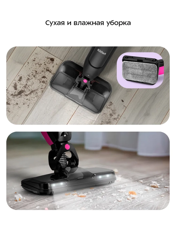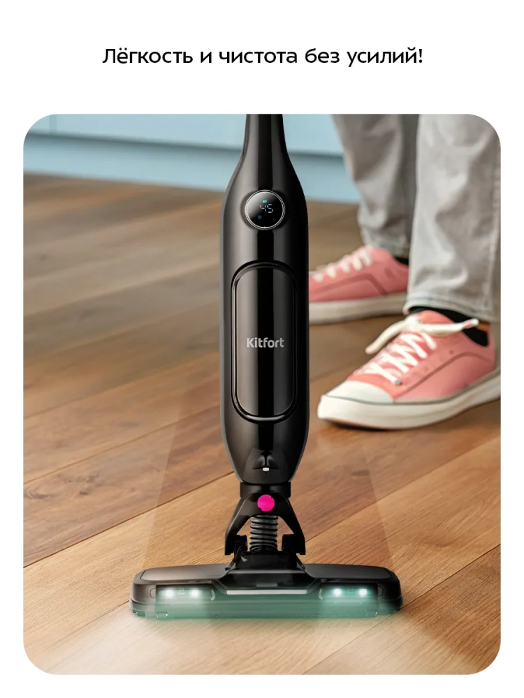 Вертикальный беспроводной моющий пылесос Kitfort КТ-5232 очень удобен для проведения сухой или влажной уборки. Благодаря работе от аккумулятора во время использования пылесос не нужно включать в сеть и провода не будут мешать под ногами. Полностью заряженный пылесос работает до 17 минут.