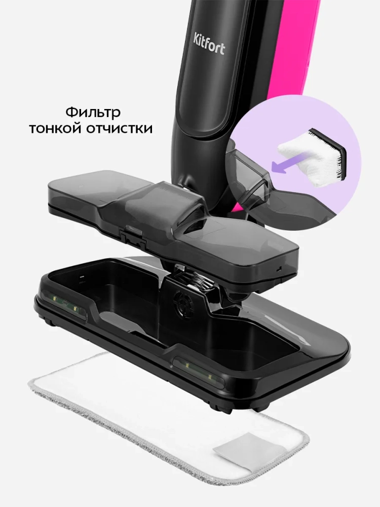 Принцип работы пылесоса КТ-5232 прост: при сухой уборке сухой мусор всасывается пылесосом и попадает в пылесборник, расположенный на насадке для пола. Во время влажной уборки вода подается перед насадкой для пола через распылитель на корпусе пылесоса. На насадку для пола закрепляется тряпка из материала, который хорошо впитывает воду. Резервуар для воды емкостью 300 мл расположен на задней стороне корпуса устройства.