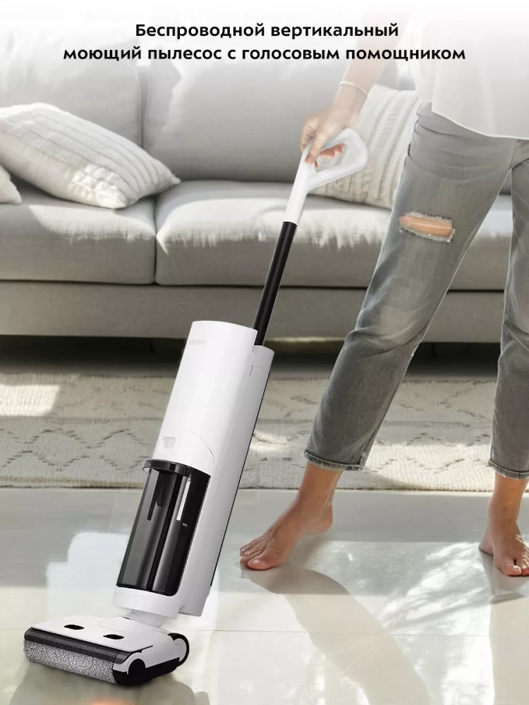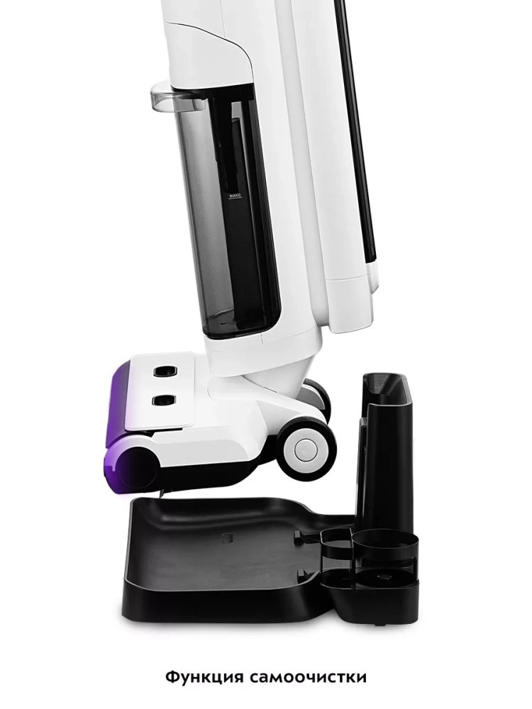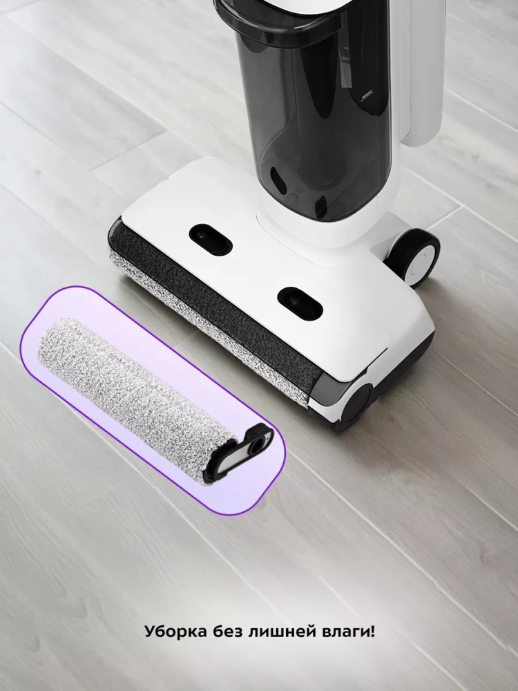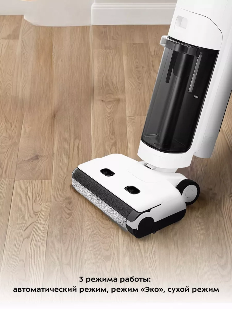 Вы сами можете выбрать, сколько воды подавать на валик турбощетки, включив соответствующий режим. У устройства три режима работы: автоматический режим влажной уборки с усиленной подачей воды, режим «Эко» со стандартной подачей воды и режим сухой уборки без подачи воды.