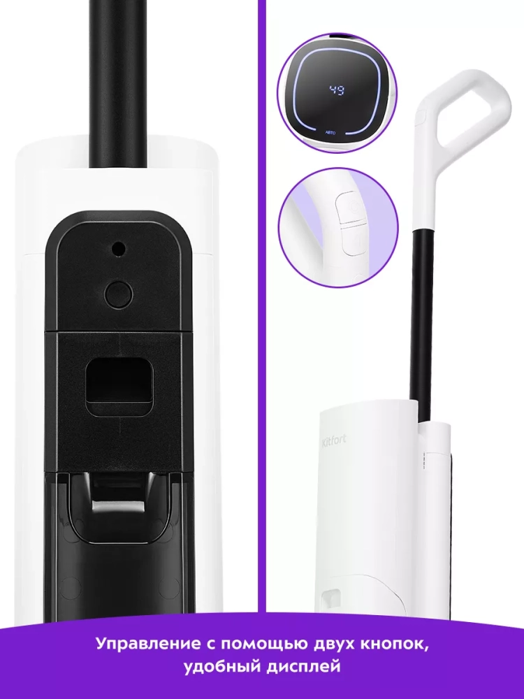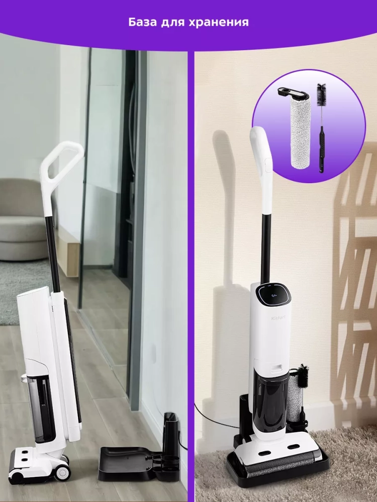 Беспроводной вертикальный моющий пылесос Kitfort КТ-5253 очень удобен при проведении влажной и сухой уборки. Благодаря работе от аккумулятора во время использования пылесос не нужно включать в сеть и провода не будут мешаться под ногами.